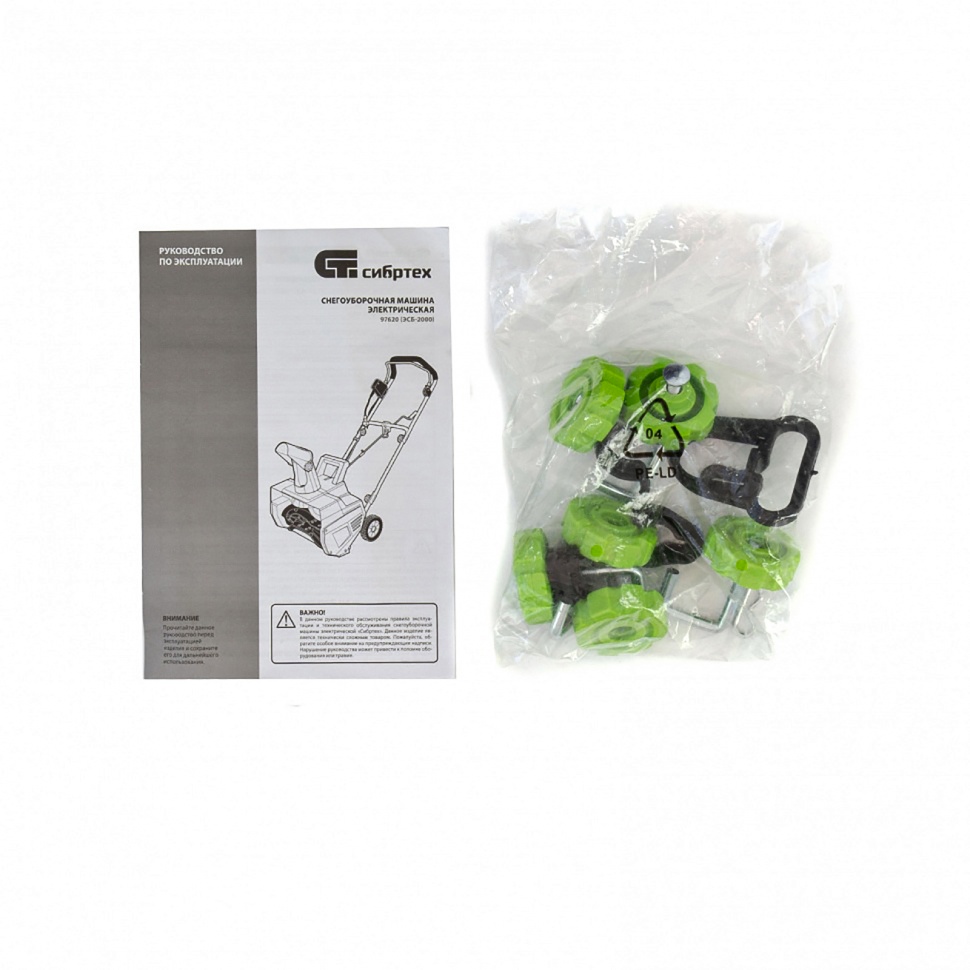 Снегоуборочная машина - 1 шт, Верхняя рукоятка - 1 шт, Средняя стойка - 1 шт, Скобка крепления ручки J - 4 шт, Гайка-барашек для крепления ручки - 4 шт, Ручка поворота выпускного желоба - 1 шт, Пружинный штифт - 1 шт, Дефлектор - 1 шт, Гайка-барашек для крепления дефлектора - 2 шт, Винт с полукруглой головой - 2 шт, Скоба крепления провода - 1 шт, Руководство по эксплуатации и гарантийный талон - 1 шт |
