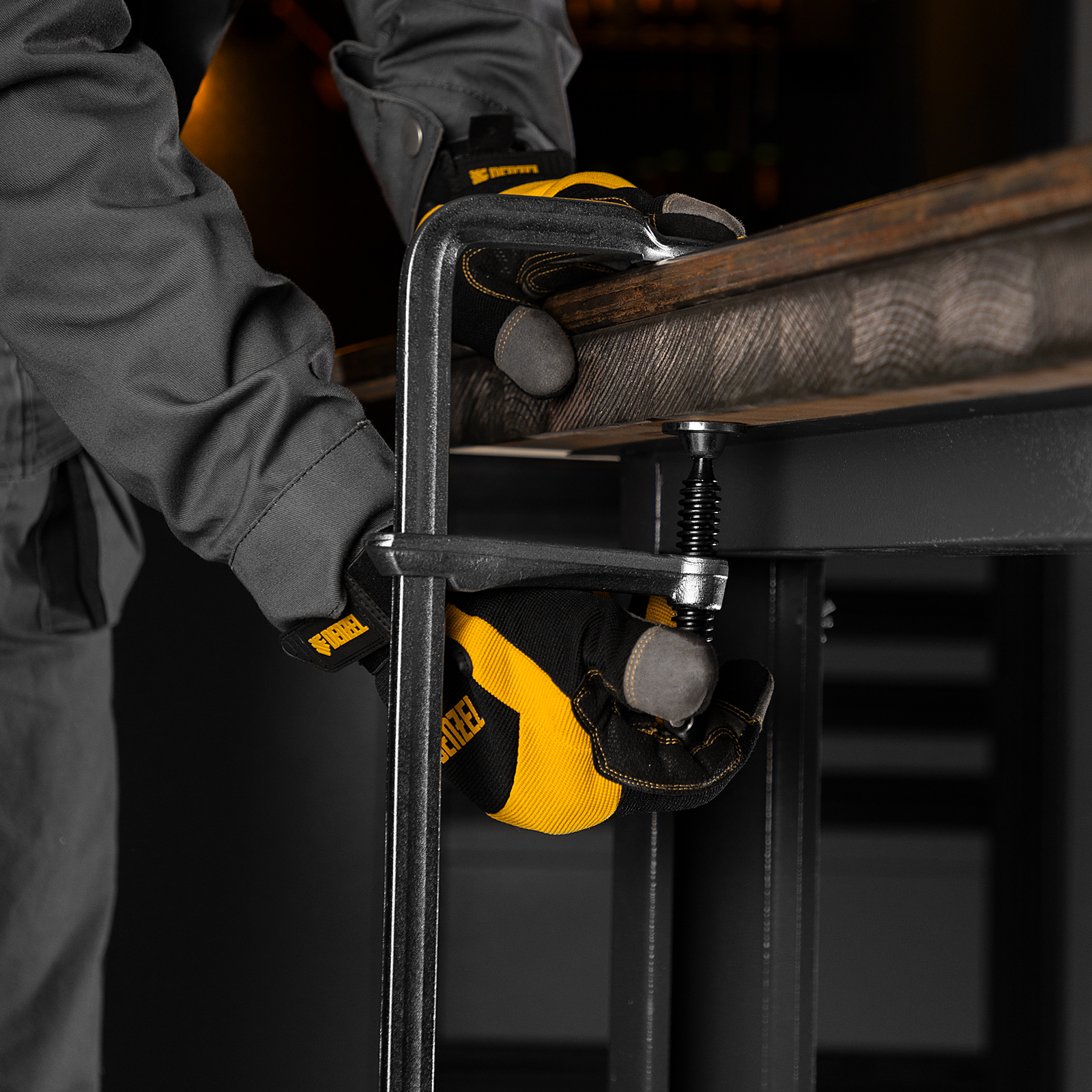 Кованая F-образная струбцина Denzel 20472 с глубиной зажима 100 мм, усиленная, предназначена для фиксации деталей шириной до 600 мм и материалов при проведении слесарных, столярных и сварочных работ. Тавровый профиль обеспечивает устойчивость конструкции к изгибу, что позволяет фиксировать детали со значительным усилием. Струбцина подходит для профессионального применения.