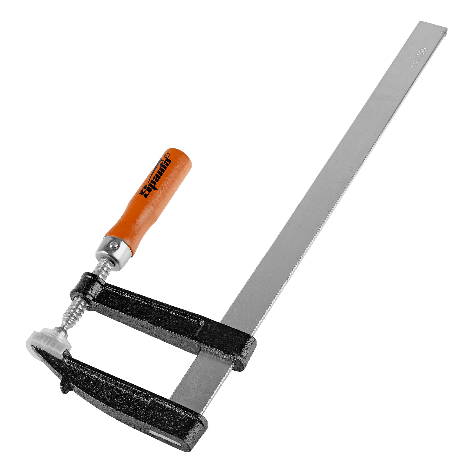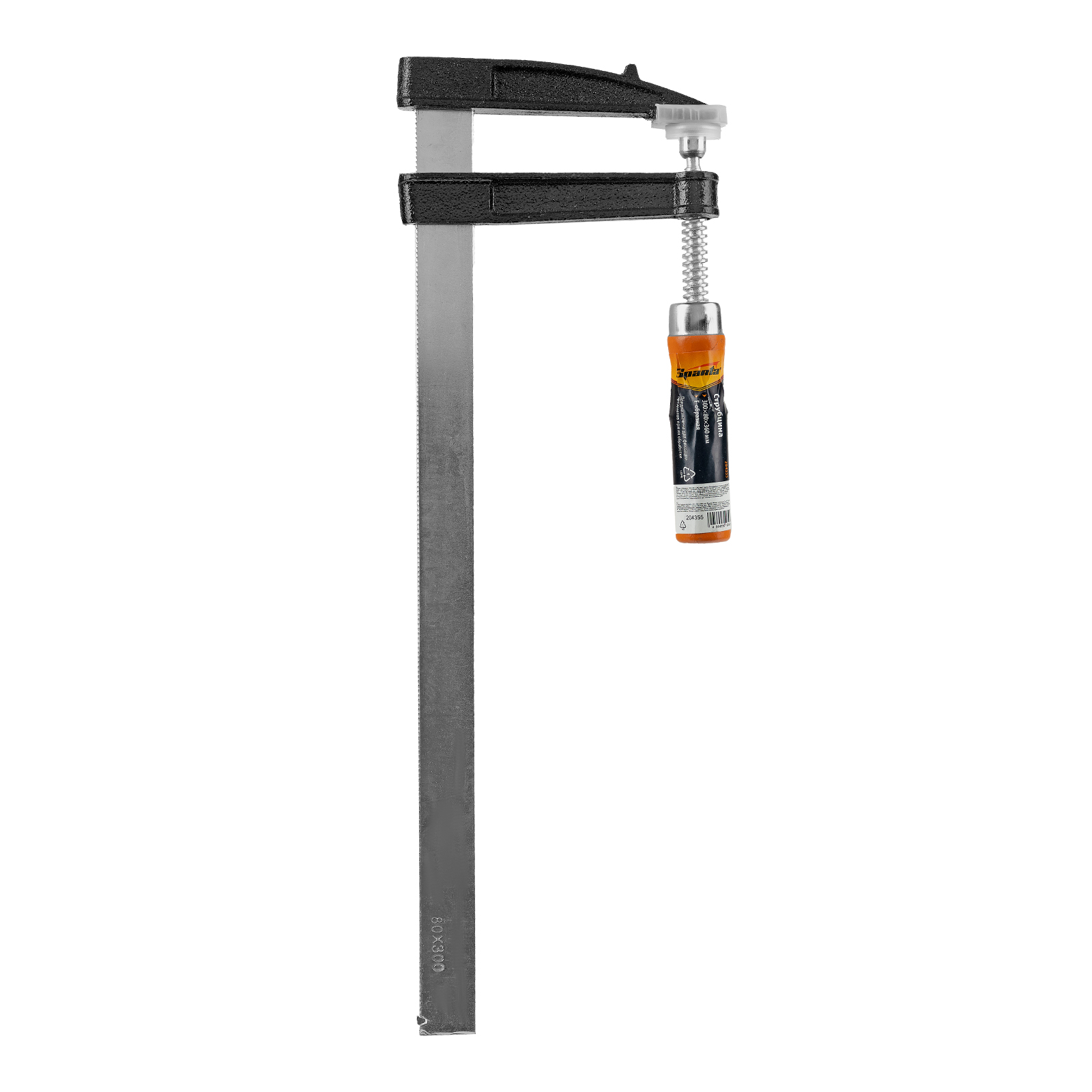 F-образная струбцина Sparta 204355 длиной 360 мм и величиной зажима 300 х 80 мм позволяет фиксировать заготовки из металла, древесины и других материалов для их соединения или обработки. Используется в столярном и слесарном деле. Деталь помещают между губками, одна из которых подвижна и служит для регулировки величины захвата. Винтовой зажим позволяет фиксировать заготовку со значительным усилием. Элементы конструкции выдерживают высокую температуру, поэтому струбцина подходит для проведения сварочных работ, при этом пластиковые накладки необходимо снять.