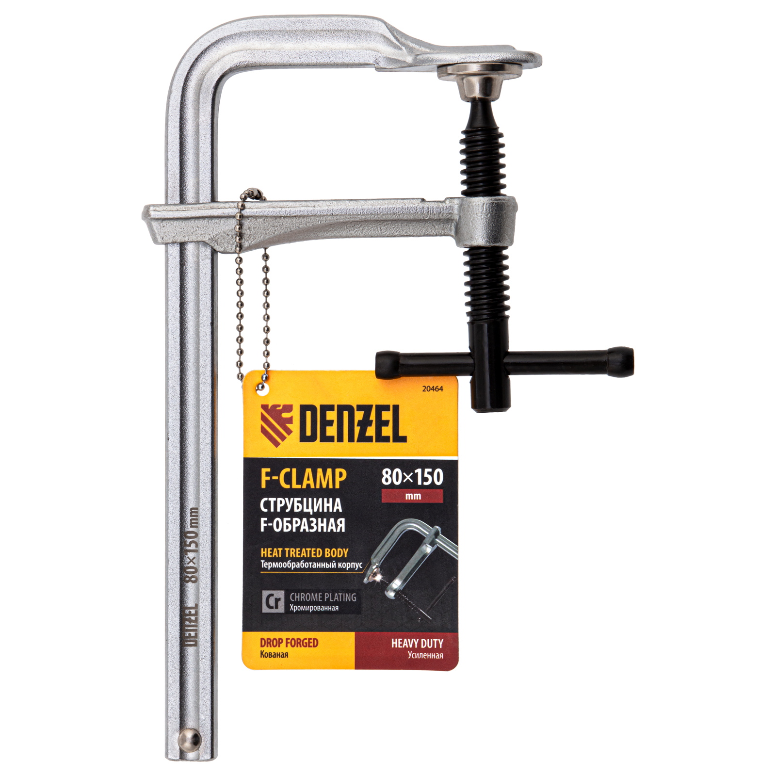 Кованая F-образная струбцина Denzel 20464 с глубиной зажима 80 мм, усиленная, предназначена для фиксации деталей шириной до 150 мм и материалов при проведении слесарных, столярных и сварочных работ. Тавровый профиль обеспечивает устойчивость конструкции к изгибу, что позволяет фиксировать детали со значительным усилием. Струбцина подходит для профессионального применения.
