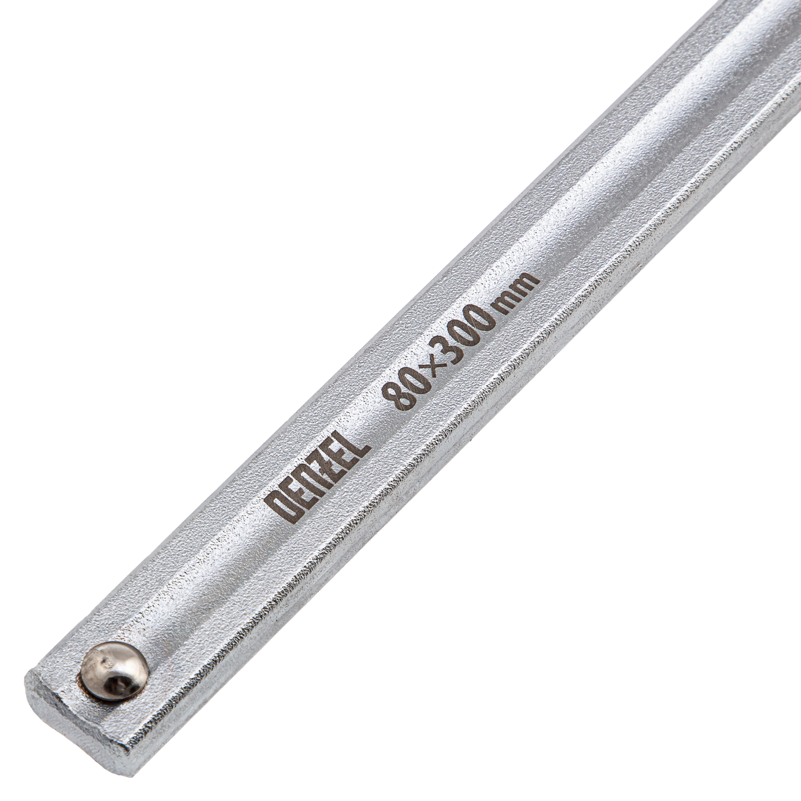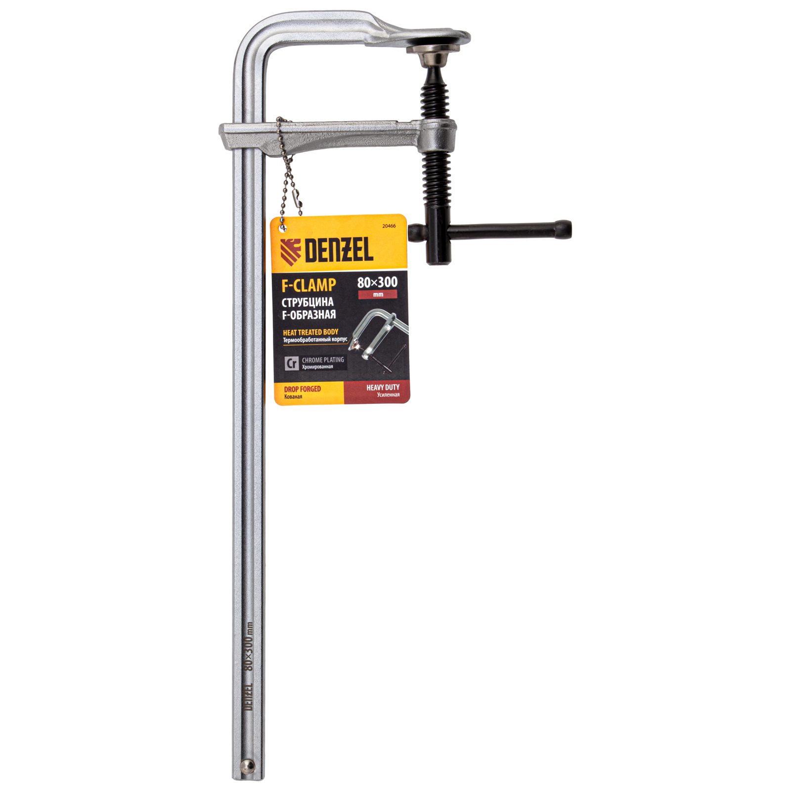 Кованая F-образная струбцина Denzel 20466 с глубиной зажима 80 мм, усиленная, предназначена для фиксации деталей шириной до 300 мм и материалов при проведении слесарных, столярных и сварочных работ. Тавровый профиль обеспечивает устойчивость конструкции к изгибу, что позволяет фиксировать детали со значительным усилием. Струбцина подходит для профессионального применения.