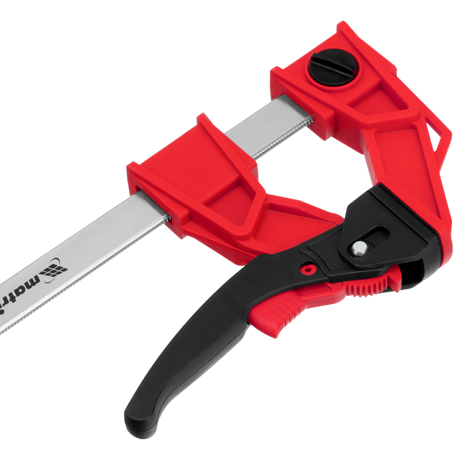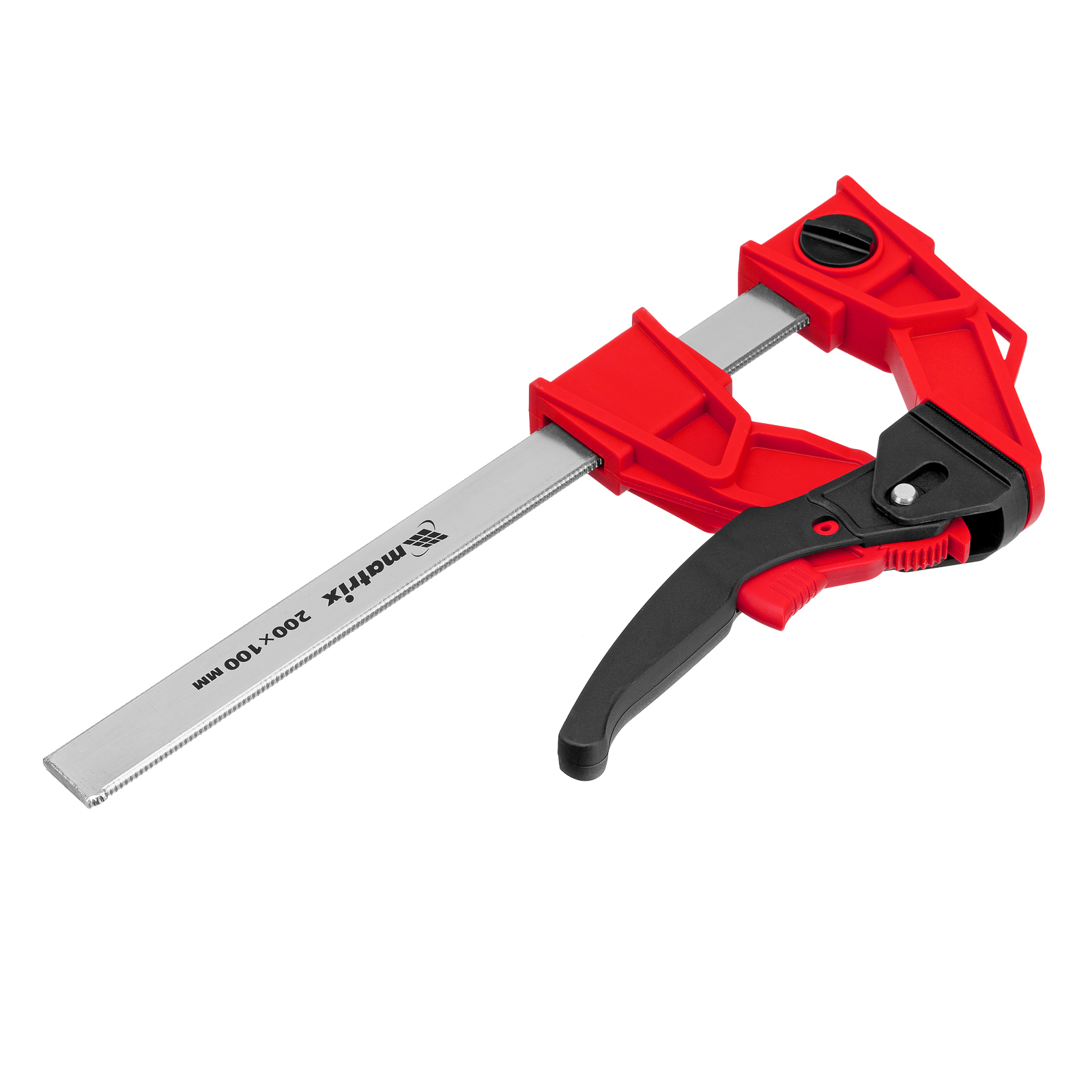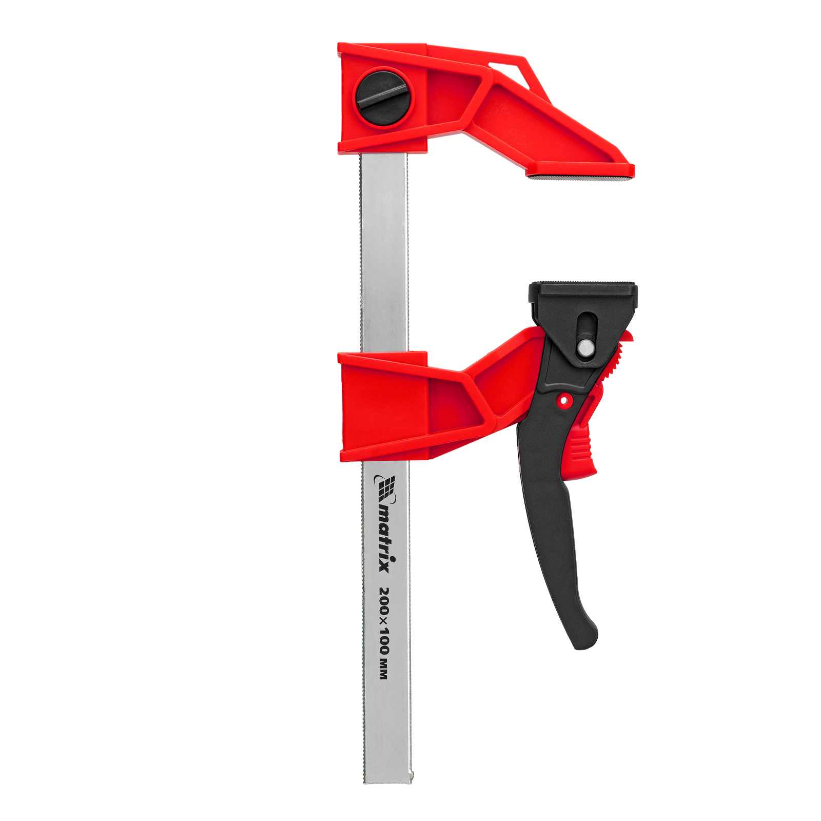 Струбцина реечная быстрозажимная Matrix 20726 размером 200 х 100 х 351 мм, со штангой сечением 5 х 22 мм, с усиленным пластиковым корпусом и рычажным храповым механизмом, предназначена для кратковременной фиксации деталей с целью их склеивания, а также опиливания, сверления и другой обработки. Рычажный храповый механизм позволяет перемещать подвижную губку на небольшое расстояние, сжимая заготовку со значительным усилием. Струбцина пригодится в столярной мастерской, а также будет полезна в быту.