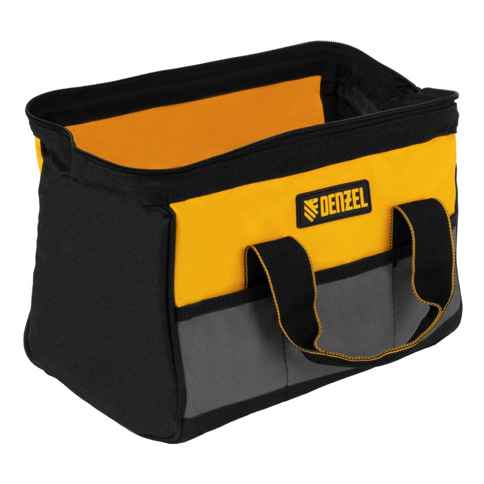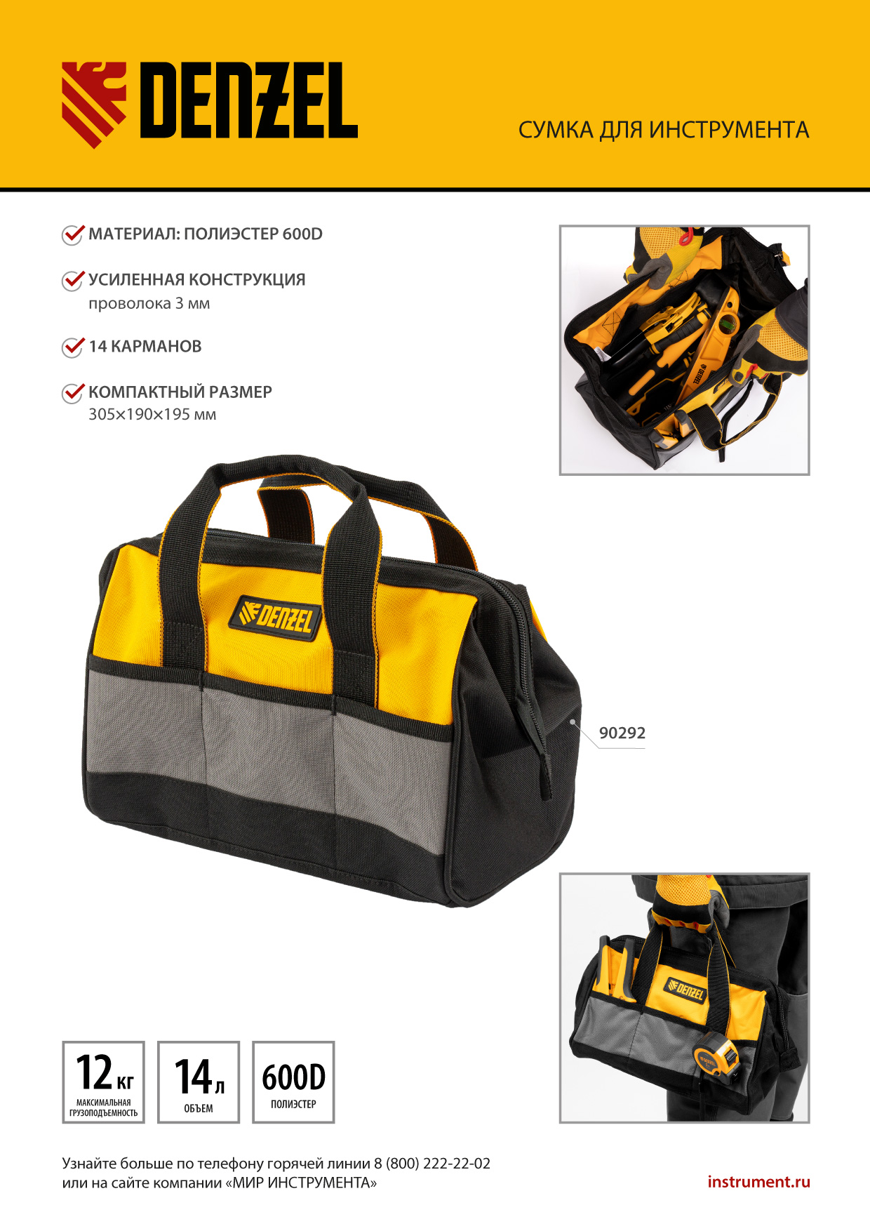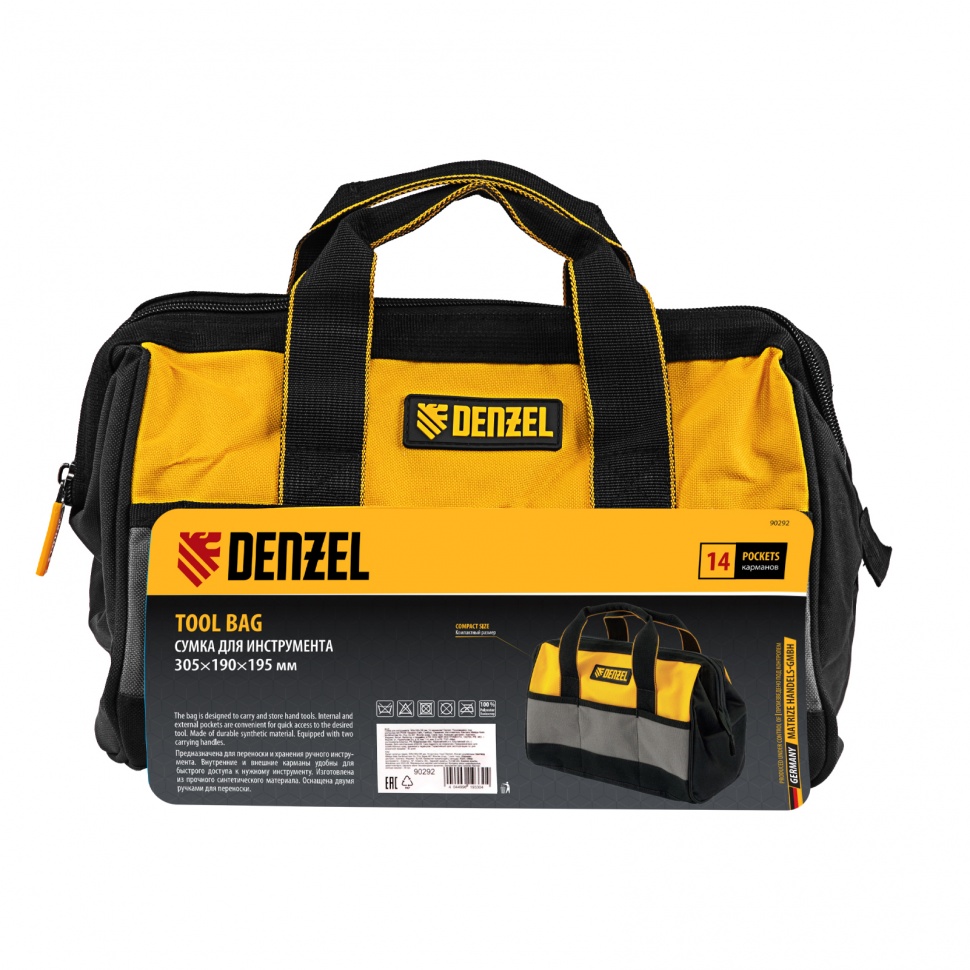Сумка Denzel 90292 с 14 карманами, габаритами 305 х 190 х 195 мм, предназначена для хранения и транспортировки инструментов. Пригодится строителям, сантехникам, монтажникам и автовладельцам.