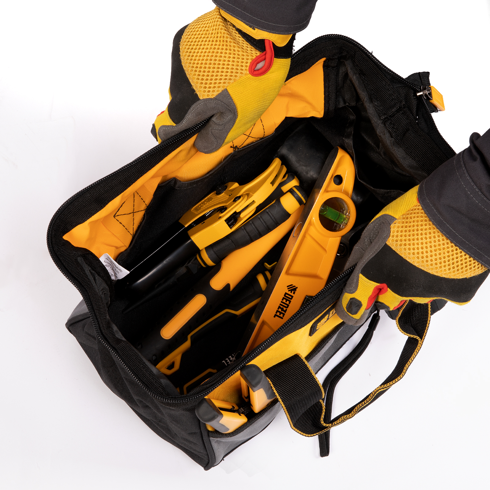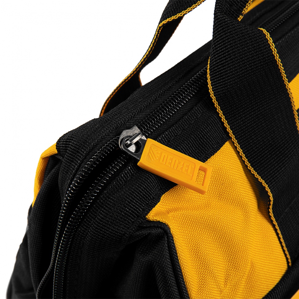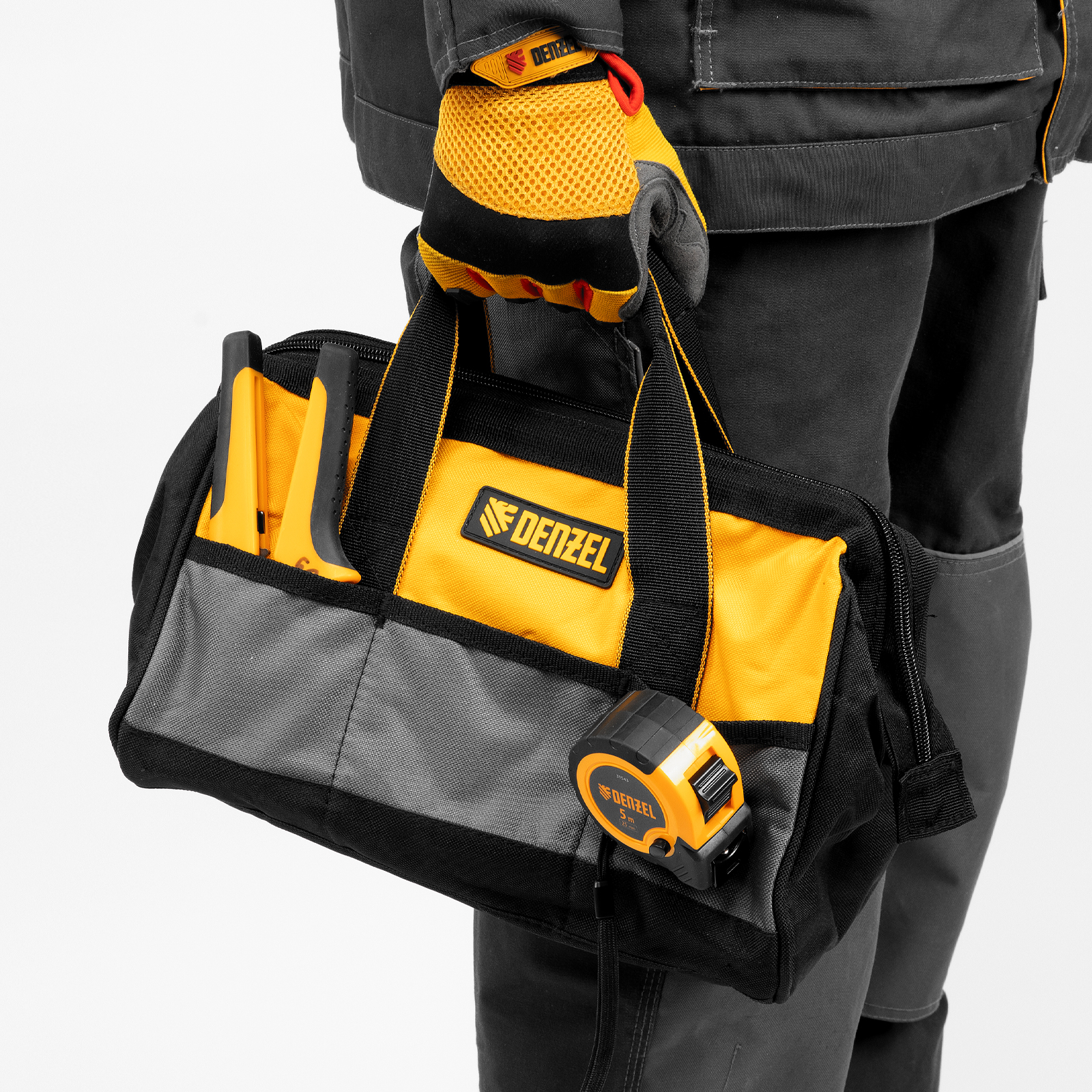 Сумка Denzel 90292 с 14 карманами, габаритами 305 х 190 х 195 мм, предназначена для хранения и транспортировки инструментов. Пригодится строителям, сантехникам, монтажникам и автовладельцам.