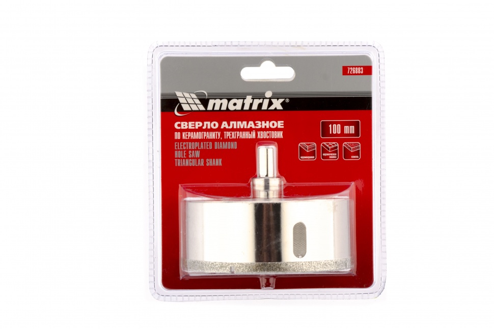 Универсальное алмазное сверло по керамограниту Matrix 726883 размером 100 х 67 мм, с 3-гранным хвостовиком, применяется для получения отверстий в стекле, плитке, кафеле. За счет высокой концентрации алмазов в режущем слое оно легко справляется со сверлением керамогранита. Сверло рассчитано на профессиональное использование с дрелями и шуруповертами. Водяное охлаждение в процессе работы значительно повышает срок службы оснастки.