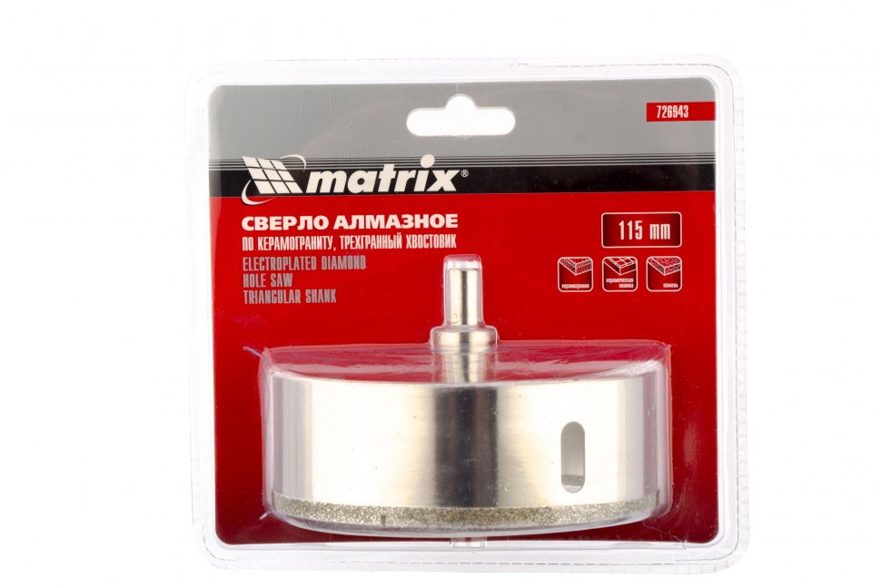 Универсальное алмазное сверло по керамограниту Matrix 726943 размером 115 х 67 мм, с 3-гранным хвостовиком, применяется для получения отверстий в стекле, плитке, кафеле. За счет высокой концентрации алмазов в режущем слое оно легко справляется со сверлением керамогранита. Сверло рассчитано на профессиональное использование с дрелями и шуруповертами. Водяное охлаждение в процессе работы значительно повышает срок службы оснастки.