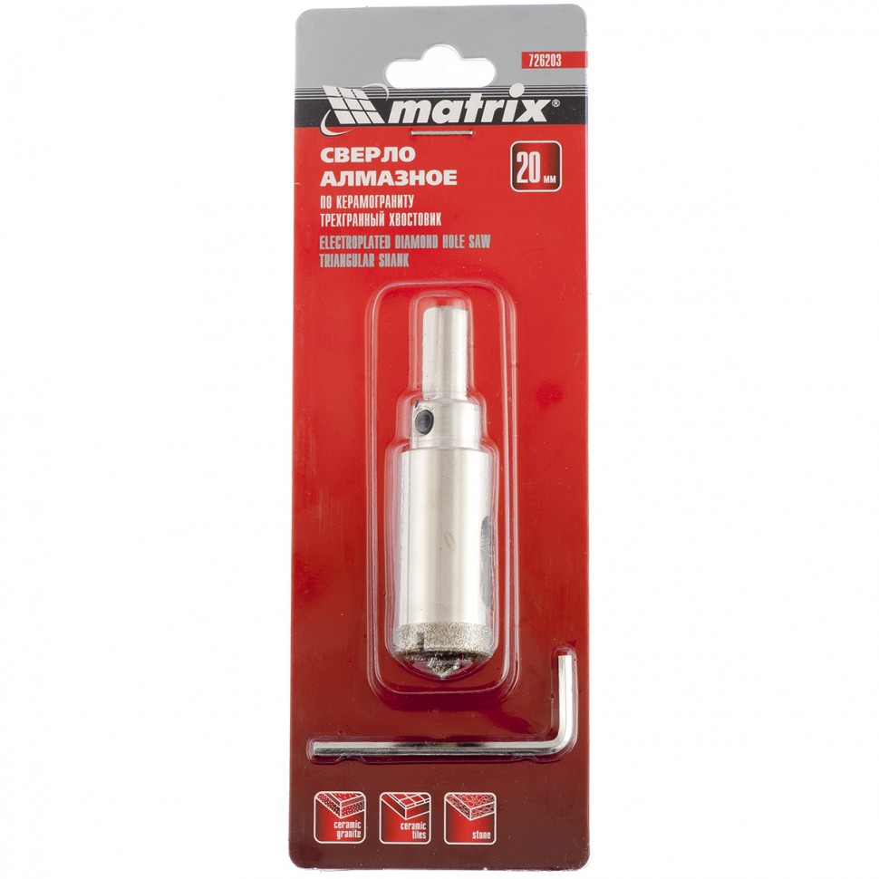 Универсальное алмазное сверло по керамограниту Matrix 726203 размером 20 х 67 мм, с 3-гранным хвостовиком, применяется для получения отверстий в стекле, плитке, кафеле. За счет высокой концентрации алмазов в режущем слое оно легко справляется со сверлением керамогранита. Сверло рассчитано на профессиональное использование с дрелями и шуруповертами. Водяное охлаждение в процессе работы значительно повышает срок службы оснастки.