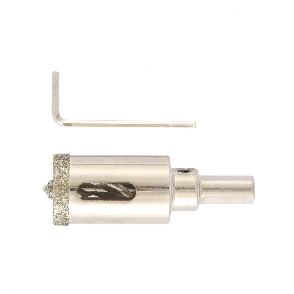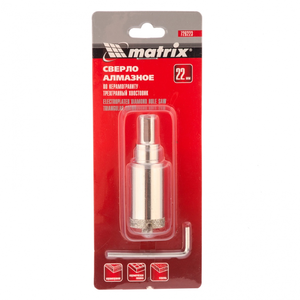 Универсальное алмазное сверло по керамограниту Matrix 726223 размером 22 х 67 мм, с 3-гранным хвостовиком, применяется для получения отверстий в стекле, плитке, кафеле. За счет высокой концентрации алмазов в режущем слое оно легко справляется со сверлением керамогранита. Сверло рассчитано на профессиональное использование с дрелями и шуруповертами. Водяное охлаждение в процессе работы значительно повышает срок службы оснастки.