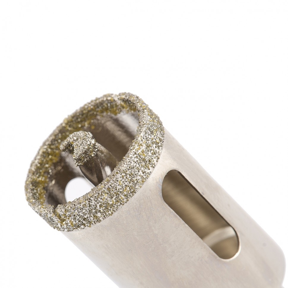 Универсальное алмазное сверло по керамограниту Matrix 726283 размером 28 х 67 мм, с 3-гранным хвостовиком, применяется для получения отверстий в стекле, плитке, кафеле. За счет высокой концентрации алмазов в режущем слое оно легко справляется со сверлением керамогранита. Сверло рассчитано на профессиональное использование с дрелями и шуруповертами. Водяное охлаждение в процессе работы значительно повышает срок службы оснастки.