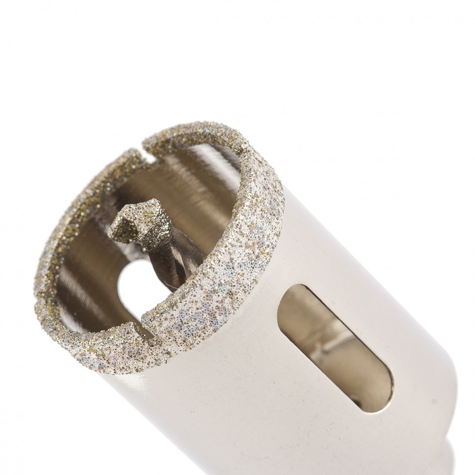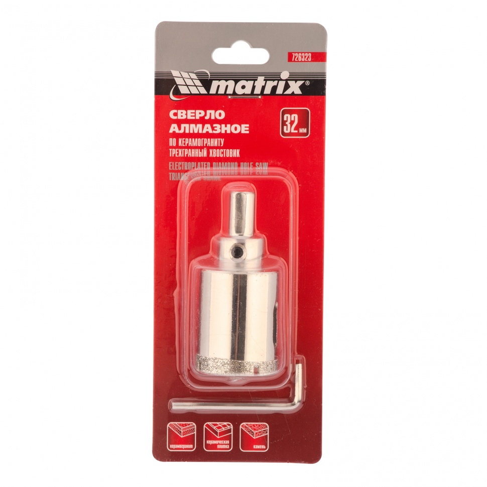 Универсальное алмазное сверло по керамограниту Matrix 726323 размером 32 х 67 мм, с 3-гранным хвостовиком, применяется для получения отверстий в стекле, плитке, кафеле. За счет высокой концентрации алмазов в режущем слое оно легко справляется со сверлением керамогранита. Сверло рассчитано на профессиональное использование с дрелями и шуруповертами. Водяное охлаждение в процессе работы значительно повышает срок службы оснастки.