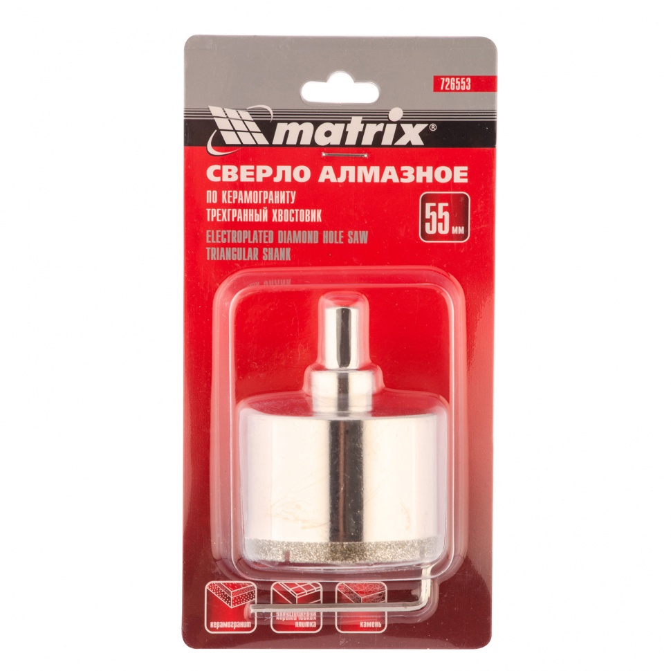 Универсальное алмазное сверло по керамограниту Matrix 726553 размером 55 х 67 мм, с 3-гранным хвостовиком, применяется для получения отверстий в стекле, плитке, кафеле. За счет высокой концентрации алмазов в режущем слое оно легко справляется со сверлением керамогранита. Сверло рассчитано на профессиональное использование с дрелями и шуруповертами. Водяное охлаждение в процессе работы значительно повышает срок службы оснастки.