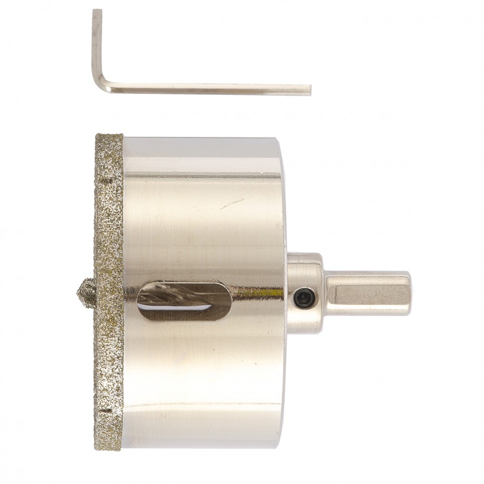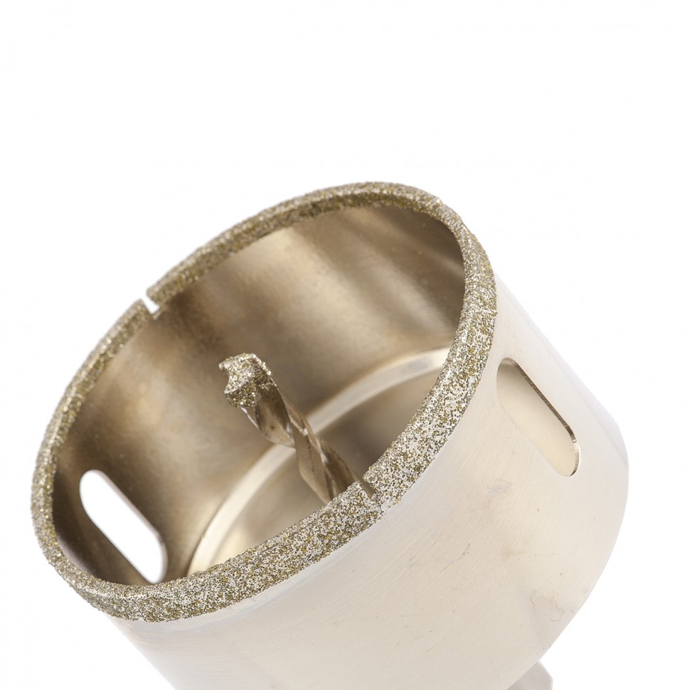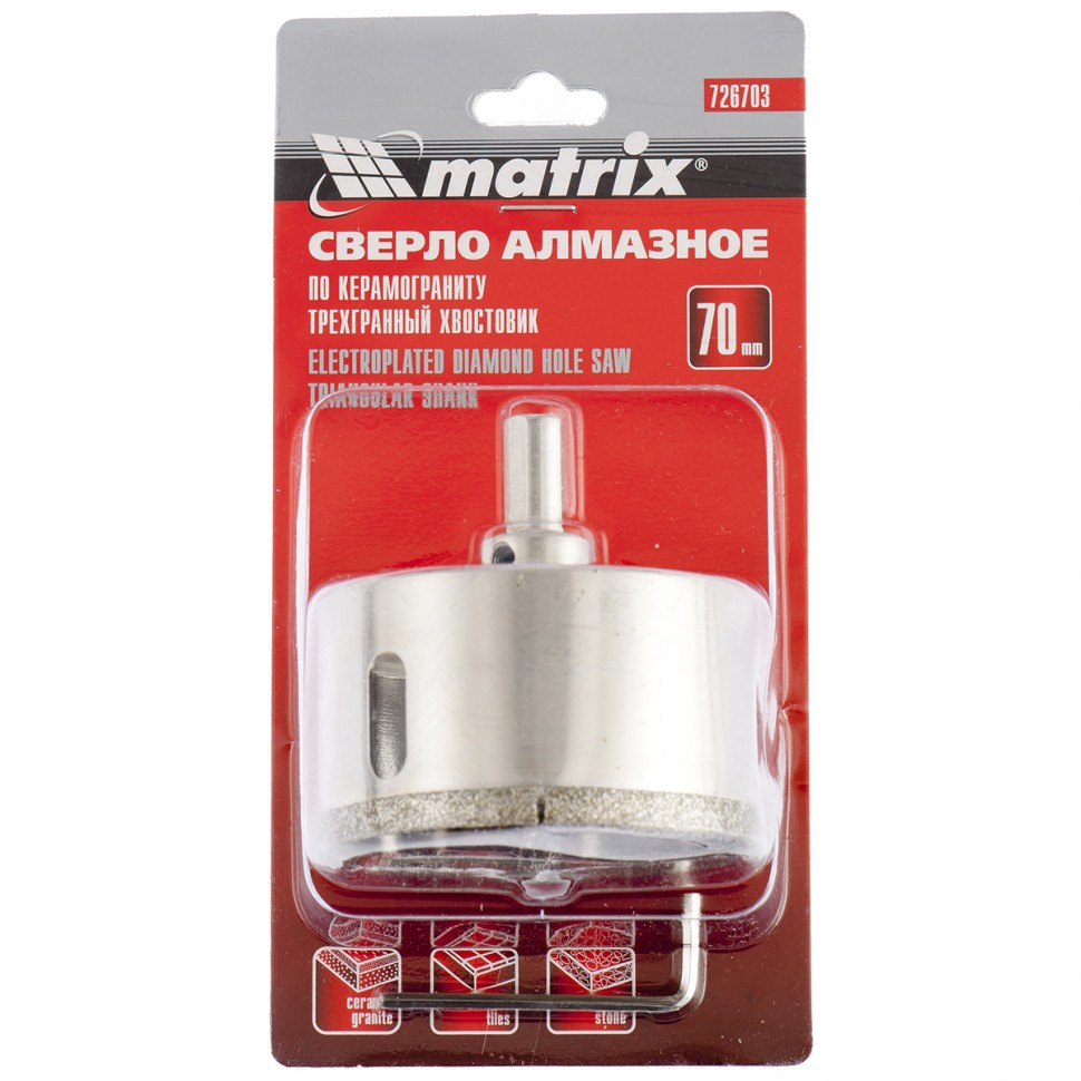 Универсальное алмазное сверло по керамограниту Matrix 726703 размером 70 х 67 мм, с 3-гранным хвостовиком, применяется для получения отверстий в стекле, плитке, кафеле. За счет высокой концентрации алмазов в режущем слое оно легко справляется со сверлением керамогранита. Сверло рассчитано на профессиональное использование с дрелями и шуруповертами. Водяное охлаждение в процессе работы значительно повышает срок службы оснастки.