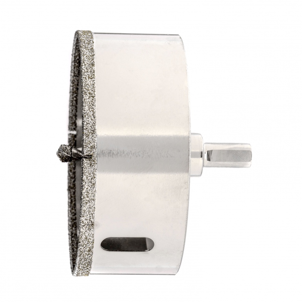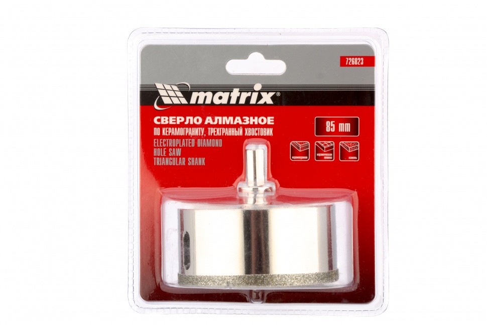 Универсальное алмазное сверло по керамограниту Matrix 726823 размером 85 х 67 мм, с 3-гранным хвостовиком, применяется для получения отверстий в стекле, плитке, кафеле. За счет высокой концентрации алмазов в режущем слое оно легко справляется со сверлением керамогранита. Сверло рассчитано на профессиональное использование с дрелями и шуруповертами. Водяное охлаждение в процессе работы значительно повышает срок службы оснастки.