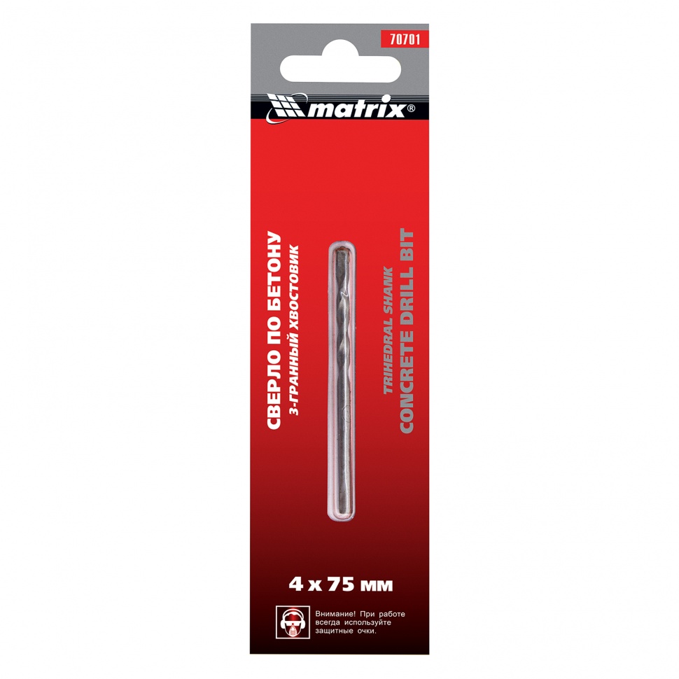 Сверло по бетону Matrix 70701 размером 4 х 75 мм, с 3-гранным хвостовиком, используется для получения отверстий с помощью дрели. Пригодится для сверления бетона, мрамора, керамики и других твердых материалов.