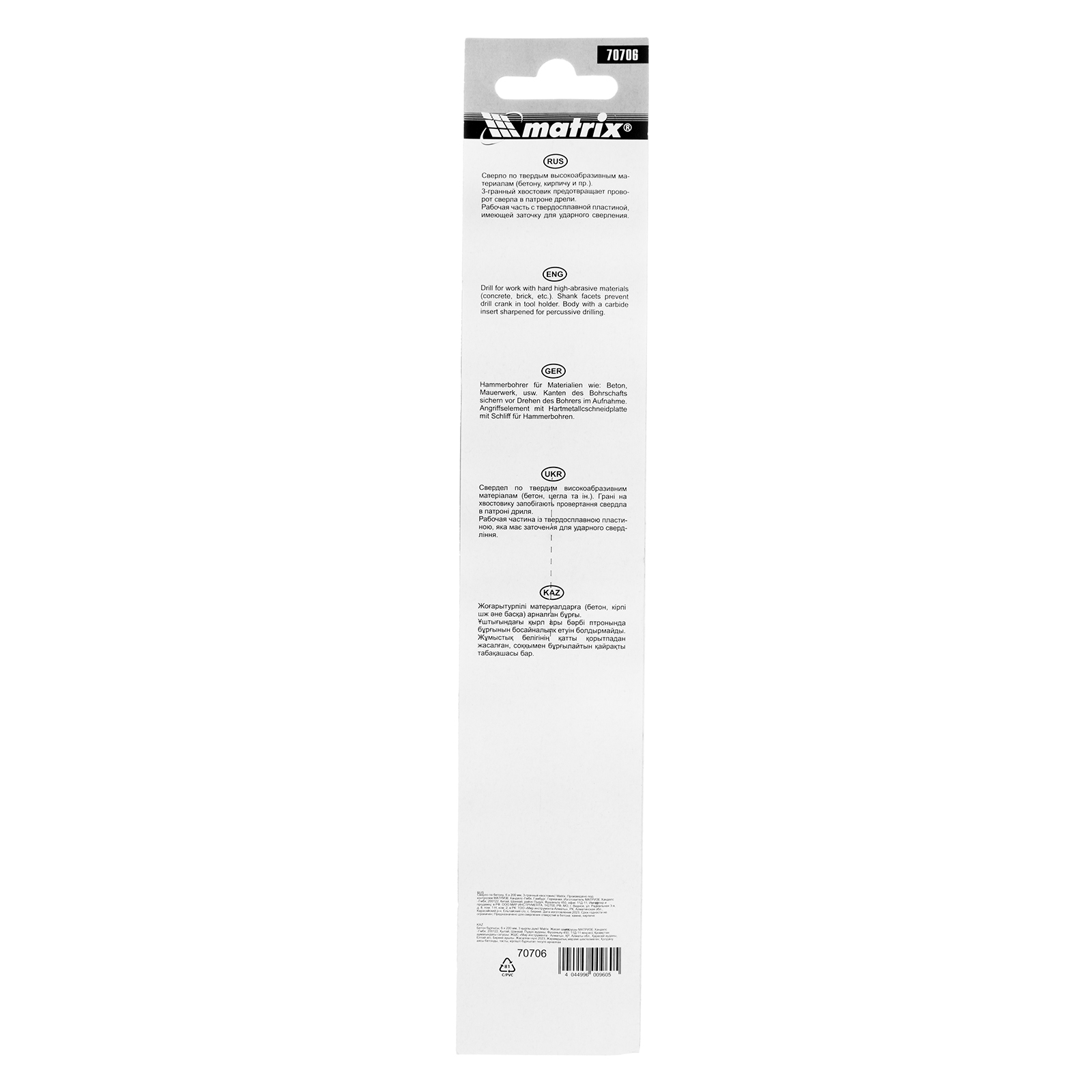 Сверло по бетону Matrix 70706 размером 6 х 200 мм, с 3-гранным хвостовиком, используется для получения отверстий с помощью дрели. Пригодится для сверления бетона, мрамора, керамики и других твердых материалов.