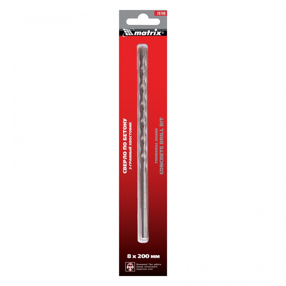 Сверло по бетону Matrix 70708 размером 8 х 200 мм, с 3-гранным хвостовиком, используется для получения отверстий с помощью дрели. Пригодится для сверления бетона, мрамора, керамики и других твердых материалов.