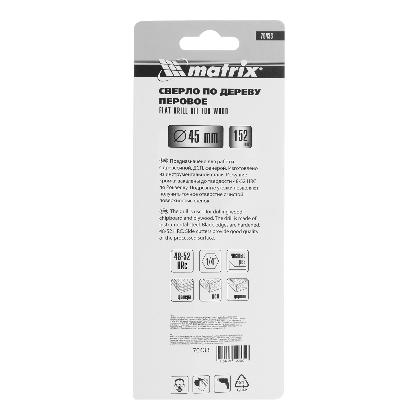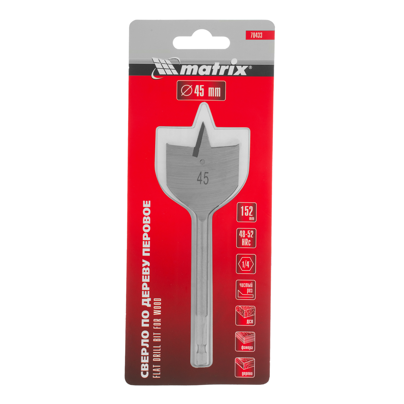 Перовое сверло по дереву Matrix 70433 диаметром 45 мм, с 6-гранным хвостовиком, имеет рабочую часть в виде «лопатки» с режущими кромками по бокам, поэтому эффективно для сверления глубоких сквозных и глухих отверстий. Оснастка устанавливается на ручную механическую или электрическую дрель, сверлильный станок, с ее помощью можно сверлить древесину любых пород.