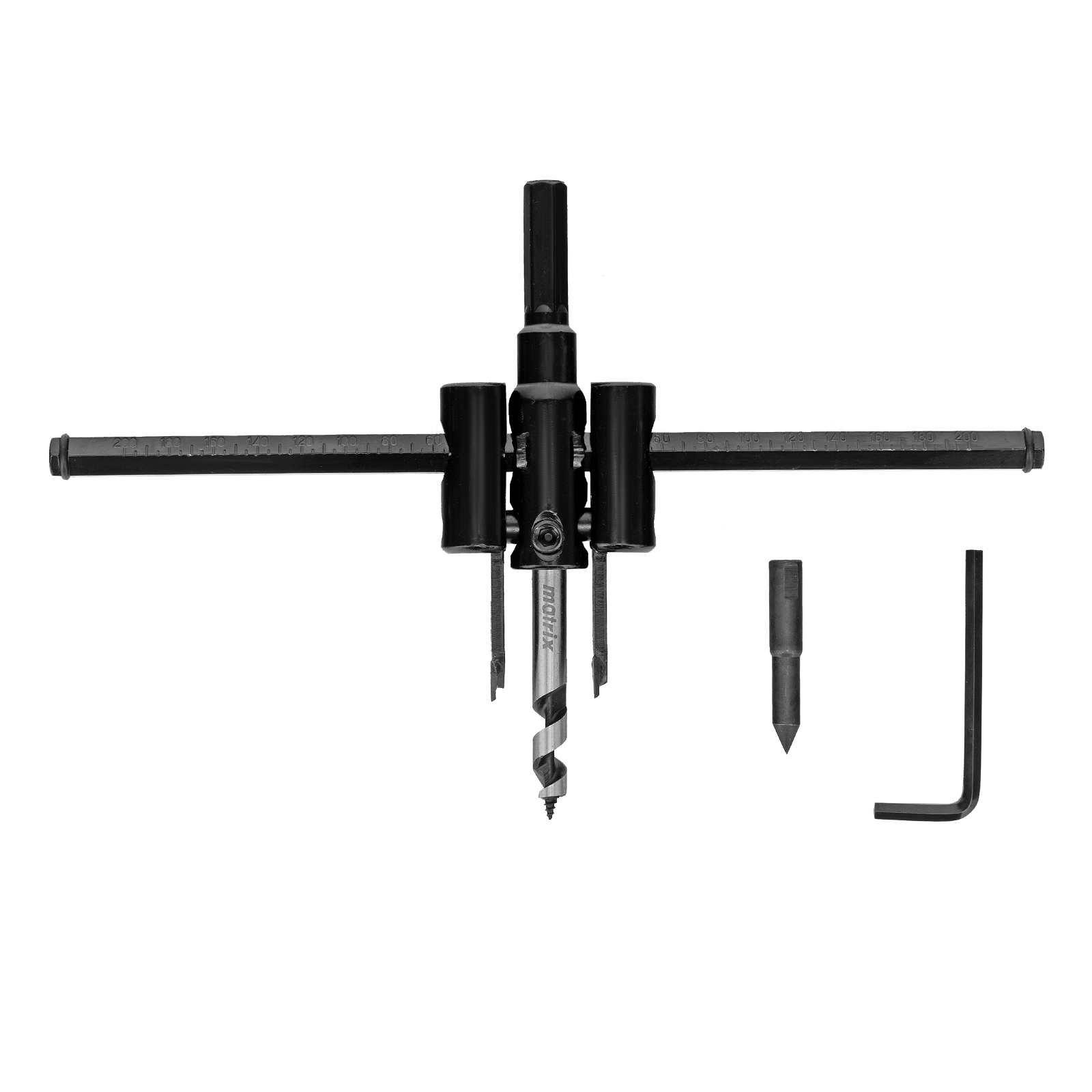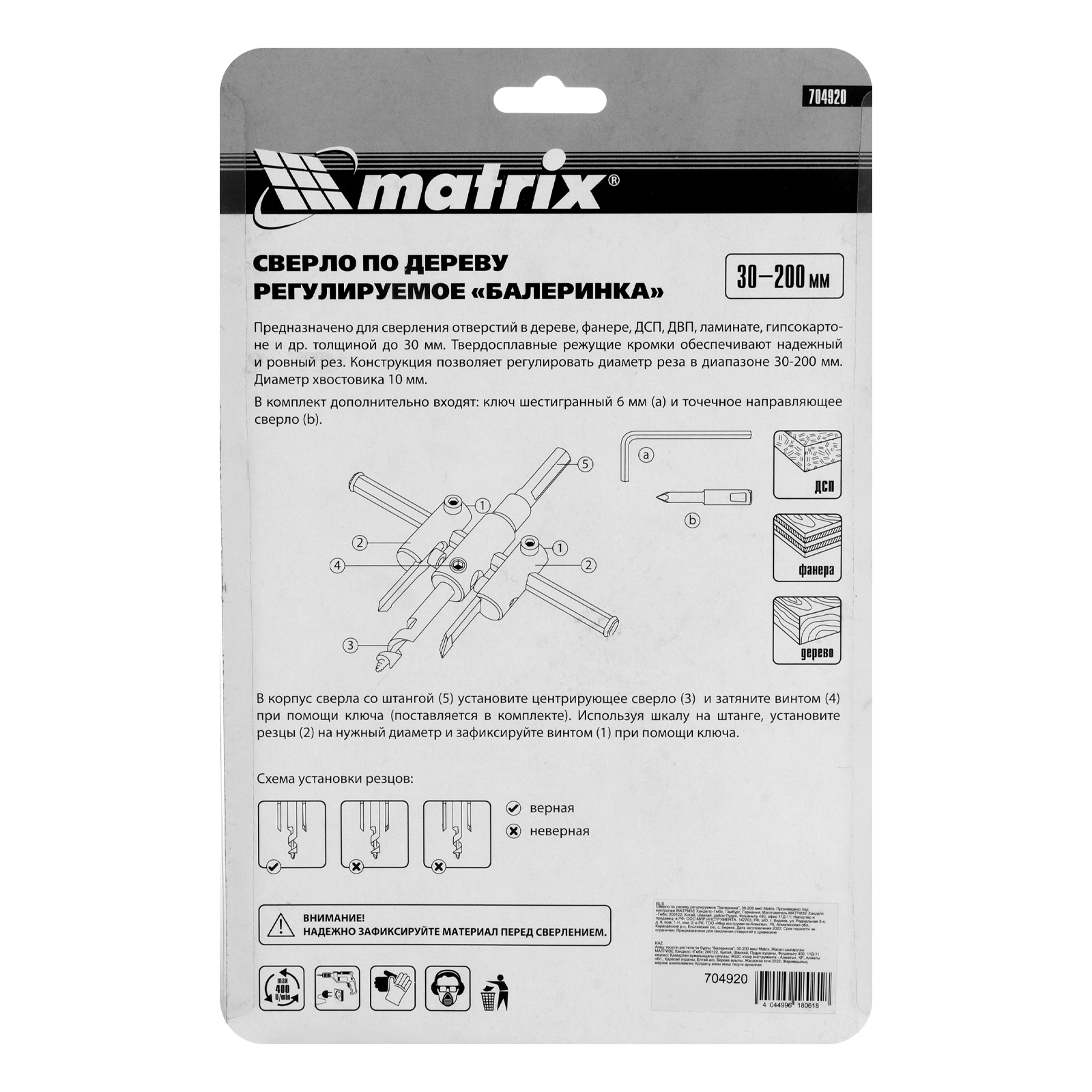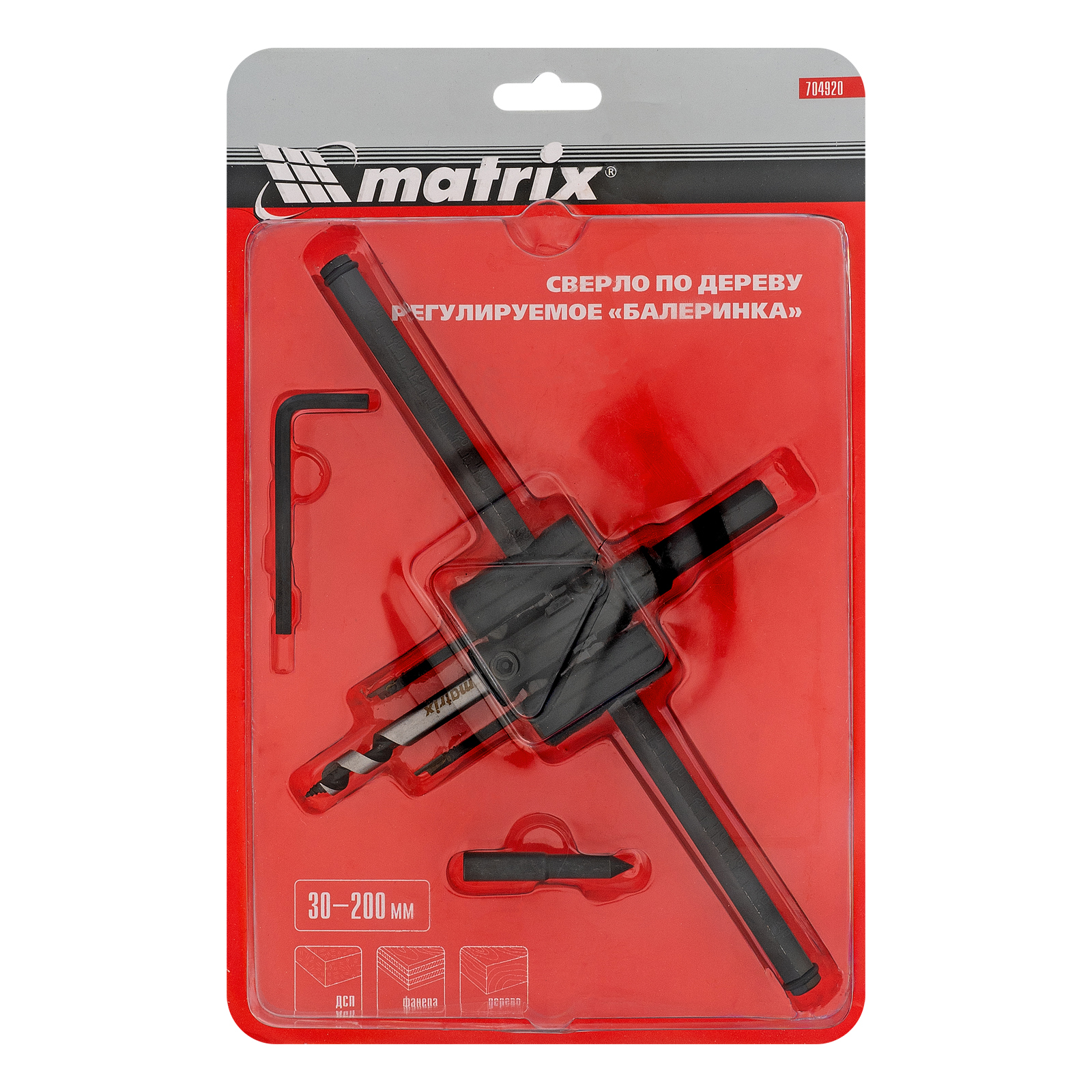 Регулируемое сверло по дереву «Балеринка» Matrix 704920 позволяет получать отверстия диаметром 30-200 мм в древесине, ДСП, МДФ и других материалах. Для удобства работы оснастка поставляется с шестигранным ключом и точечным направляющим сверлом.
