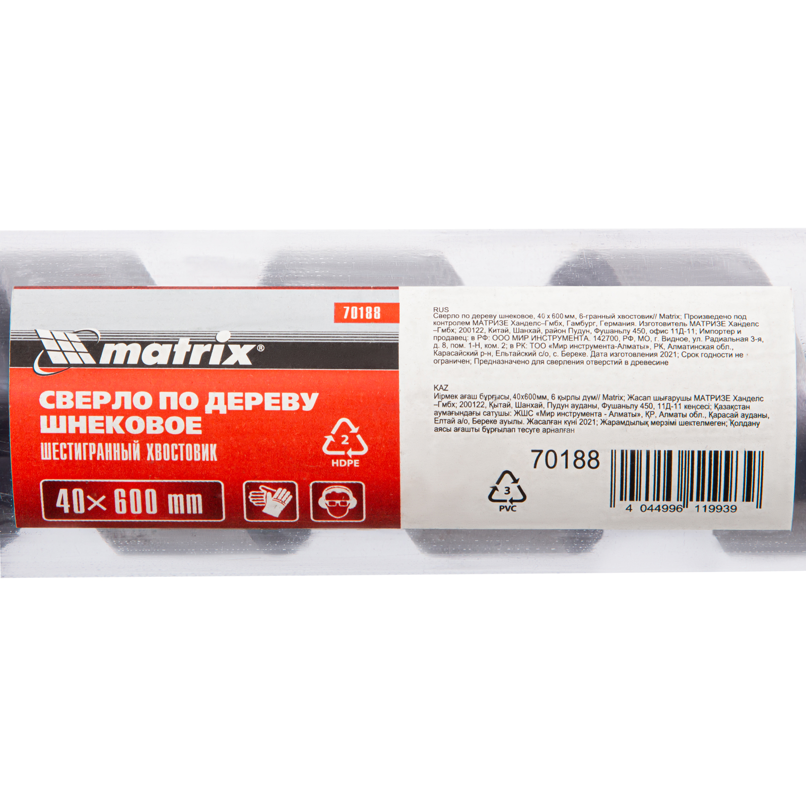 Шнековое сверло по дереву Matrix 70188 размером 40 х 600 мм, с 6-гранным хвостовиком, предназначено для получения глубоких отверстий. Подходит для работы как с мягкими, так и с твердыми породами древесины. Конструкция сверла рассчитана на интенсивное использование с высокими нагрузками в ходе строительных, ремонтных и отделочных работ.