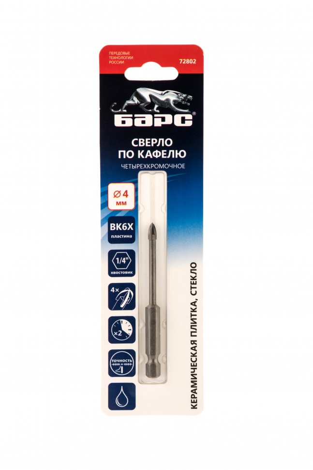 Сверло Барс 72802 диаметром 4 мм, с крестовой пластинкой и шестигранным хвостовиком, используется для сверления керамической плитки и стекла. 4-гранная режущая пластина обеспечивает высокую скорость засверливания. Сверло подходит для интенсивного профессионального использования. В процессе работы рекомендуется применять водяное охлаждение для увеличения ресурса сверла.