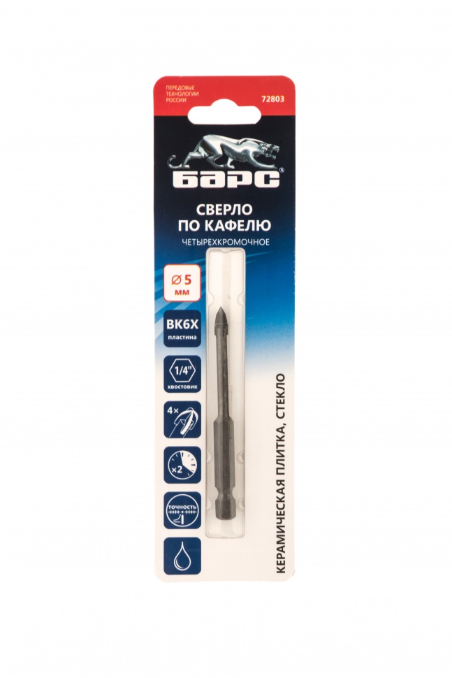 Сверло Барс 72803 диаметром 5 мм, с крестовой пластинкой и шестигранным хвостовиком, используется для сверления керамической плитки и стекла. 4-гранная режущая пластина обеспечивает высокую скорость засверливания. Сверло подходит для интенсивного профессионального использования. В процессе работы рекомендуется применять водяное охлаждение для увеличения ресурса сверла.