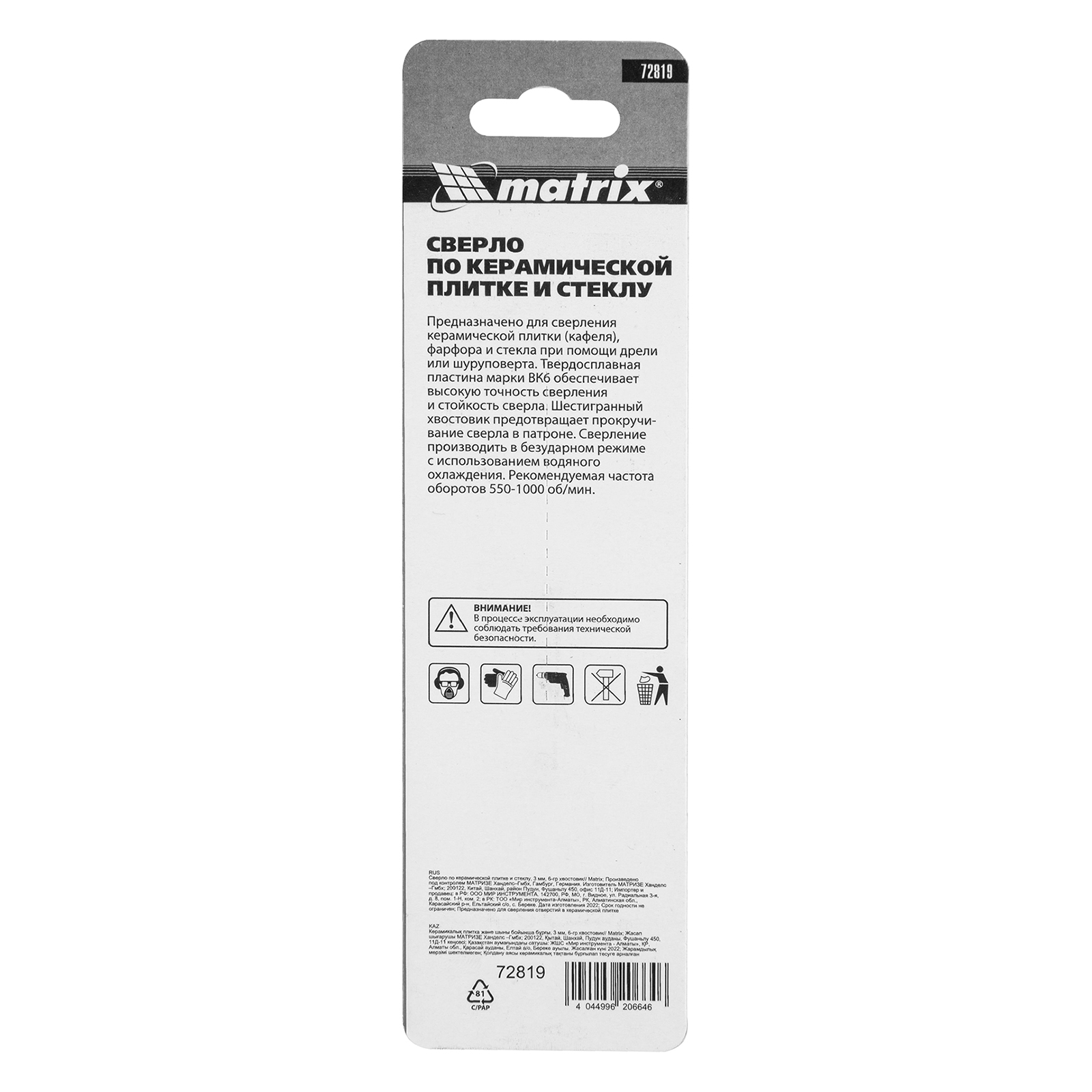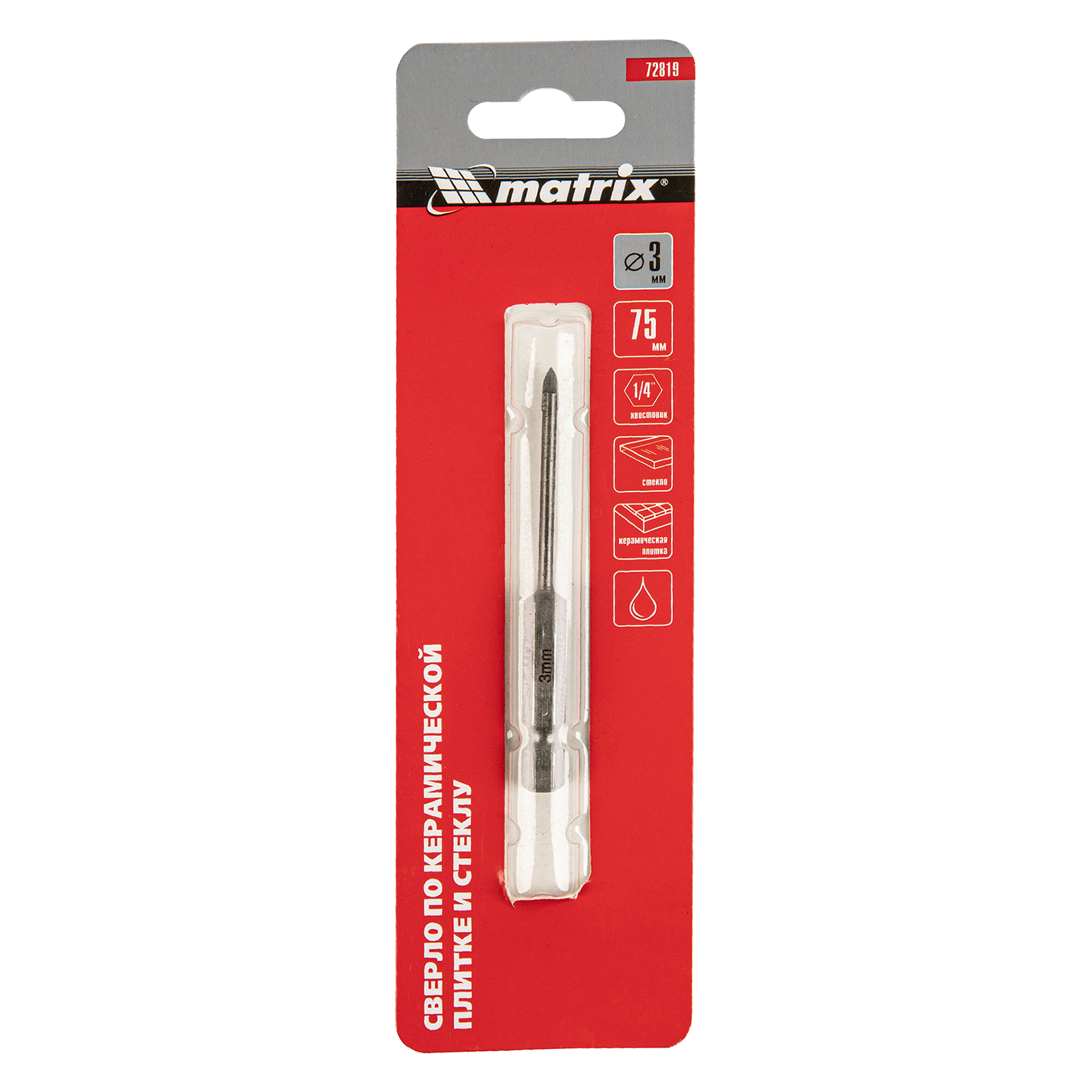 Сверло Matrix 72819 диаметром 3 мм, с шестигранным хвостовиком, используется для сверления керамической плитки, стекла и других материалов с помощью дрели или шуруповерта. Выдерживает высокие нагрузки и подходит для интенсивного использования.