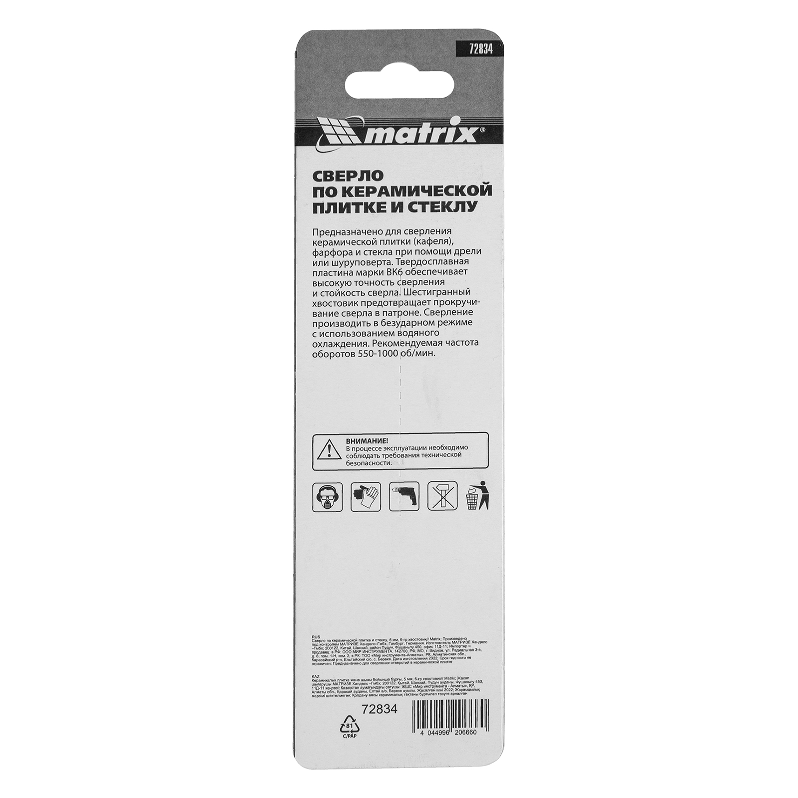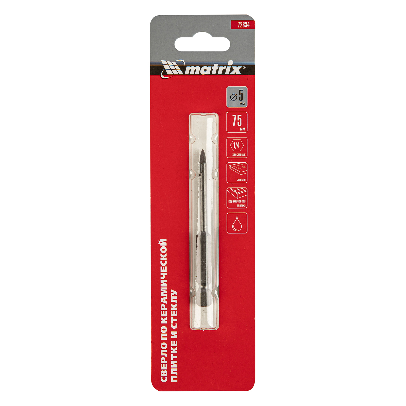 Сверло Matrix 72834 диаметром 5 мм, с шестигранным хвостовиком, используется для сверления керамической плитки, стекла и других материалов с помощью дрели или шуруповерта. Выдерживает высокие нагрузки и подходит для интенсивного использования.