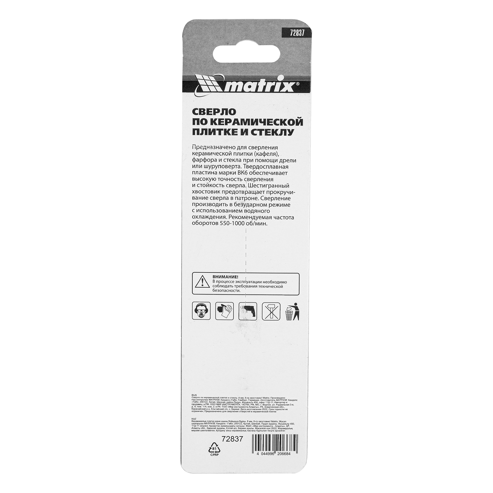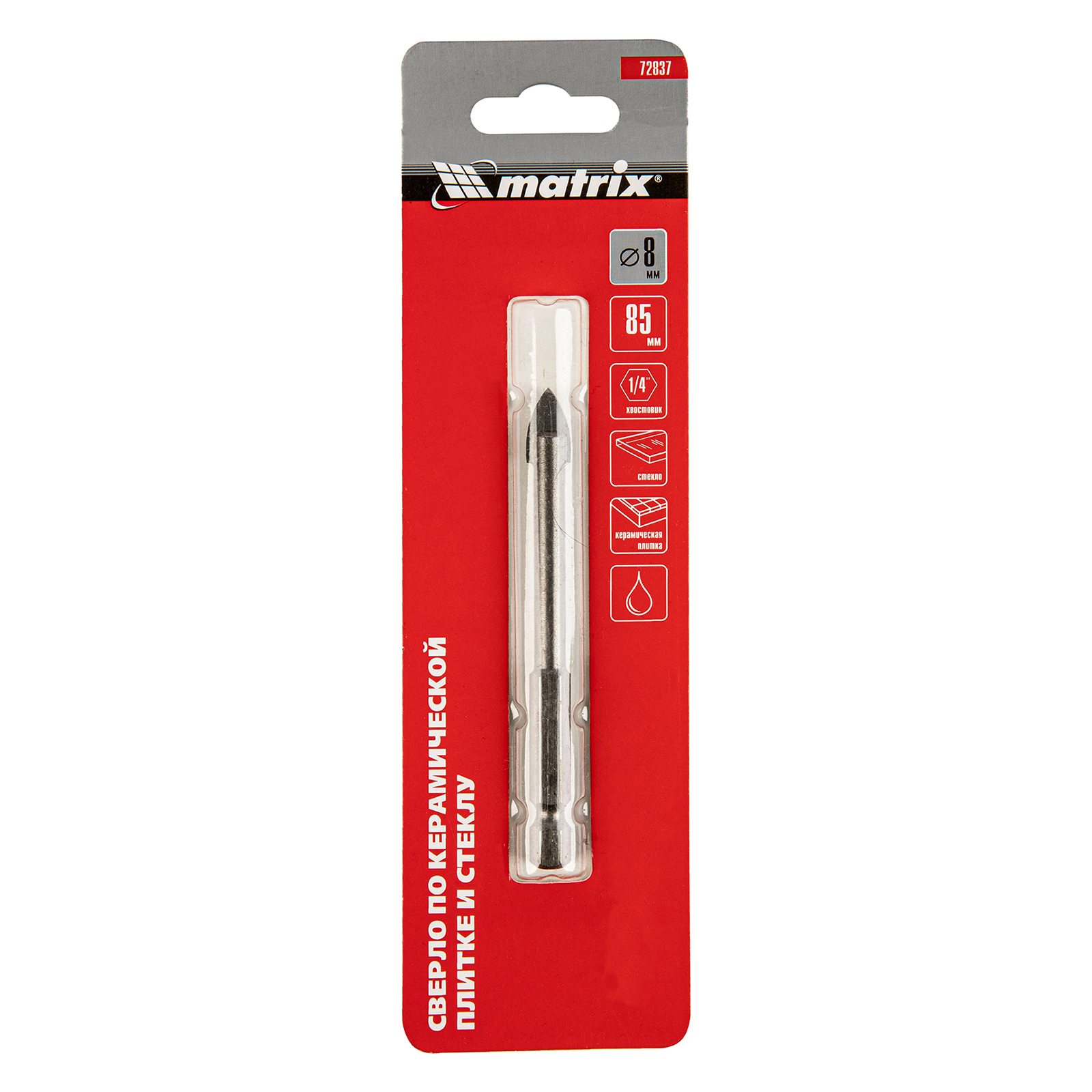 Сверло Matrix 72837 диаметром 8 мм, с шестигранным хвостовиком, используется для сверления керамической плитки, стекла и других материалов с помощью дрели или шуруповерта. Выдерживает высокие нагрузки и подходит для интенсивного использования.
