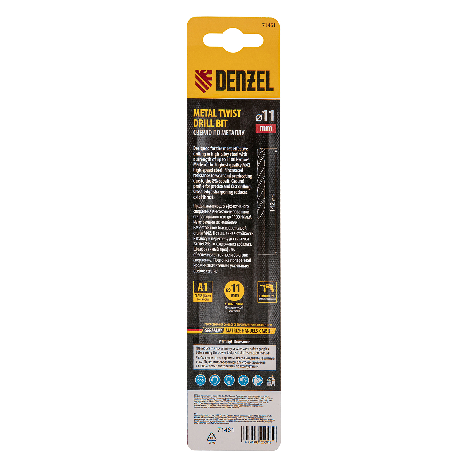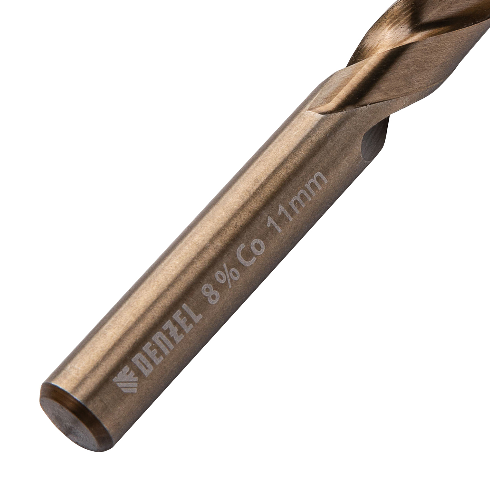 Кобальтовое сверло по металлу Denzel 71461 диаметром 11 мм, из стали HSS Co-8%, позволяет получать отверстия высокой точности в нержавеющей стали, цветных металлах, легированных и нелегированных сталях с пределом прочности до 1100 Н/мм2, а также в жестком пластике. Угол заточки 135° обеспечивает повышенную точность и чистоту сверления.