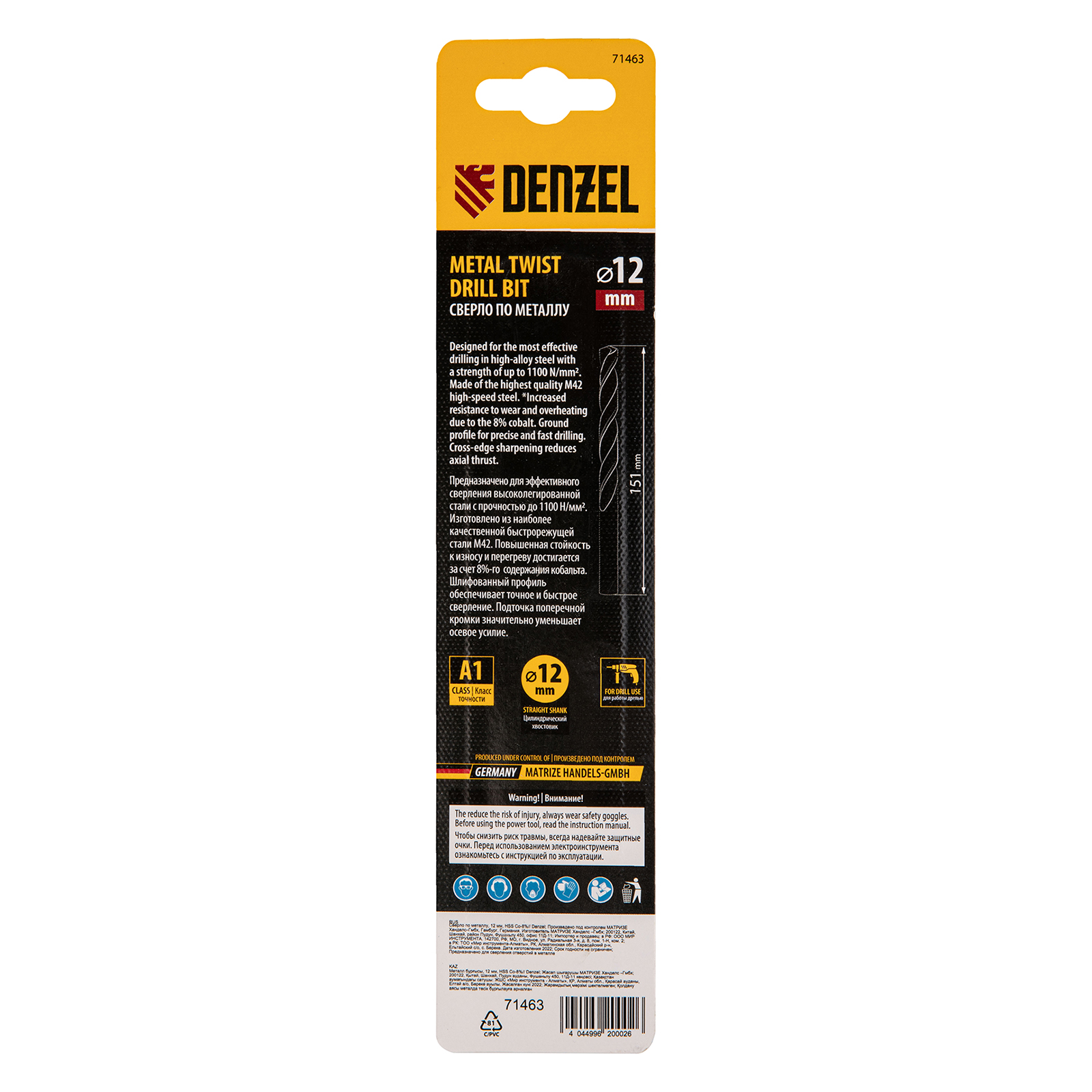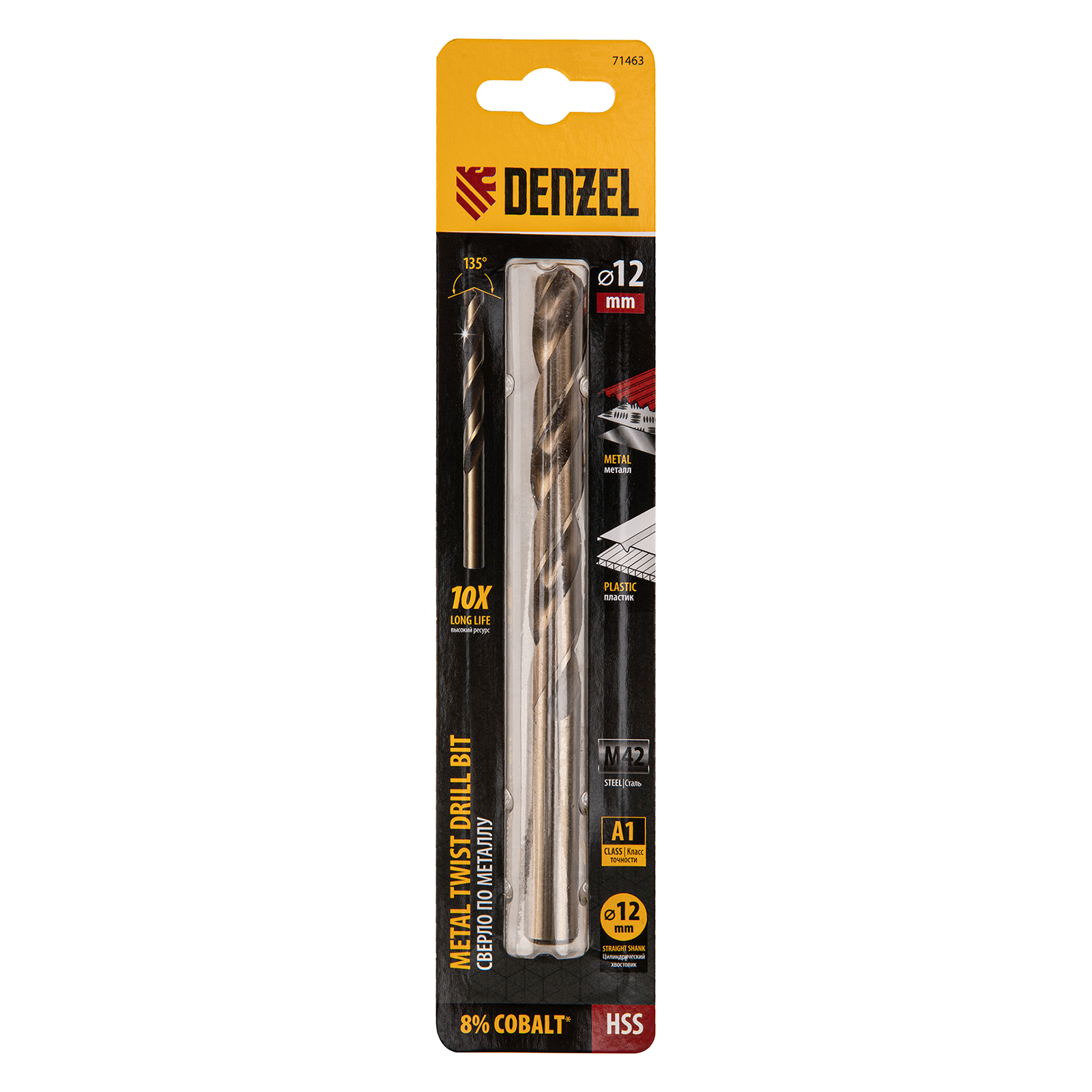 Кобальтовое сверло по металлу Denzel 71463 диаметром 12 мм, из стали HSS Co-8%, позволяет получать отверстия высокой точности в нержавеющей стали, цветных металлах, легированных и нелегированных сталях с пределом прочности до 1100 Н/мм2, а также в жестком пластике. Угол заточки 135° обеспечивает повышенную точность и чистоту сверления.