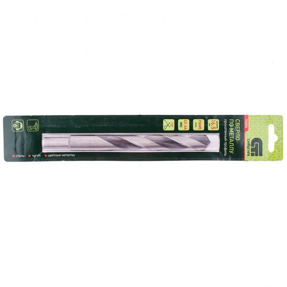 Сверло по металлу Сибртех 72293 из стали P6M5 имеет угол заточки 118 градусов и позволяет получать отверстия диаметром 16,5 мм в черных и тяжелых металлах, в том числе стали, чугуне и твердой бронзе. Сверло отличается наиболее выгодной стоимостью по сравнению с другими моделями из стали P6M5. Используется для монтажно-сборочных работ, будет полезно в быту.