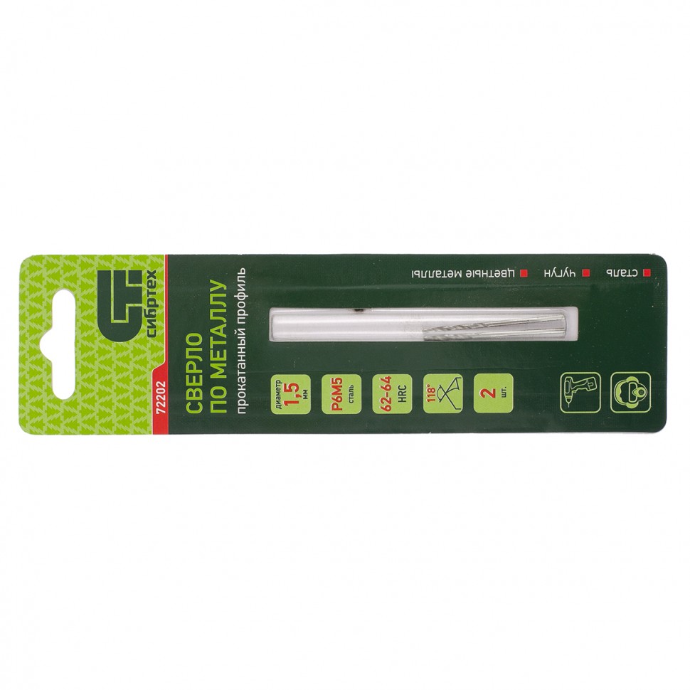 Сверло по металлу Сибртех 72202 из стали P6M5, 2 шт. в упаковке, имеет угол заточки 118 градусов и позволяет получать отверстия диаметром 1,5 мм в черных и тяжелых металлах, в том числе стали, чугуне и твердой бронзе. Сверло отличается наиболее выгодной стоимостью по сравнению с другими моделями из стали P6M5. Используется для монтажно-сборочных работ, будет полезно в быту.
