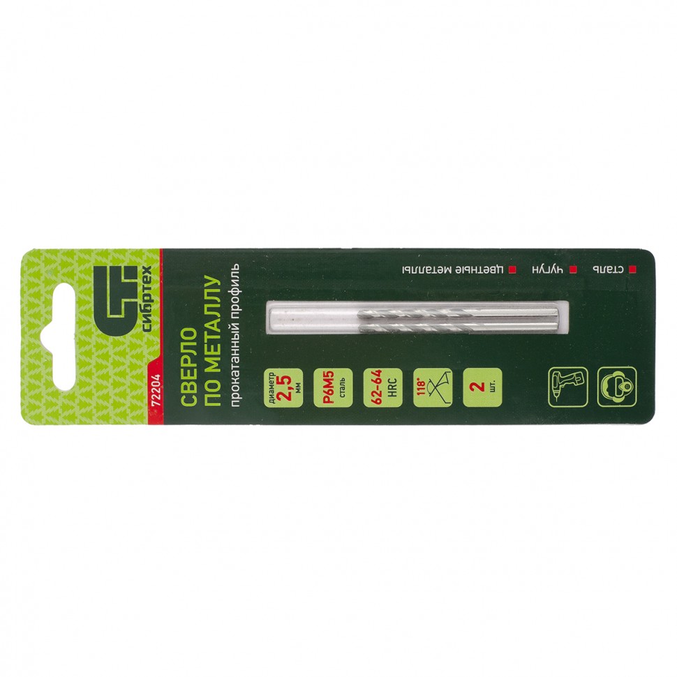 Сверло по металлу Сибртех 72204 из стали P6M5, 2 шт. в упаковке, имеет угол заточки 118 градусов и позволяет получать отверстия диаметром 2,5 мм в черных и тяжелых металлах, в том числе стали, чугуне и твердой бронзе. Сверло отличается наиболее выгодной стоимостью по сравнению с другими моделями из стали P6M5. Используется для монтажно-сборочных работ, будет полезно в быту.