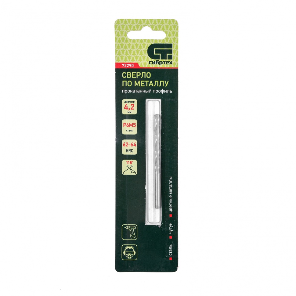 Сверло по металлу Сибртех 72290 из стали P6M5 имеет угол заточки 118 градусов и позволяет получать отверстия диаметром 4,2 мм в черных и тяжелых металлах, в том числе стали, чугуне и твердой бронзе. Сверло отличается наиболее выгодной стоимостью по сравнению с другими моделями из стали P6M5. Используется для монтажно-сборочных работ, будет полезно в быту.