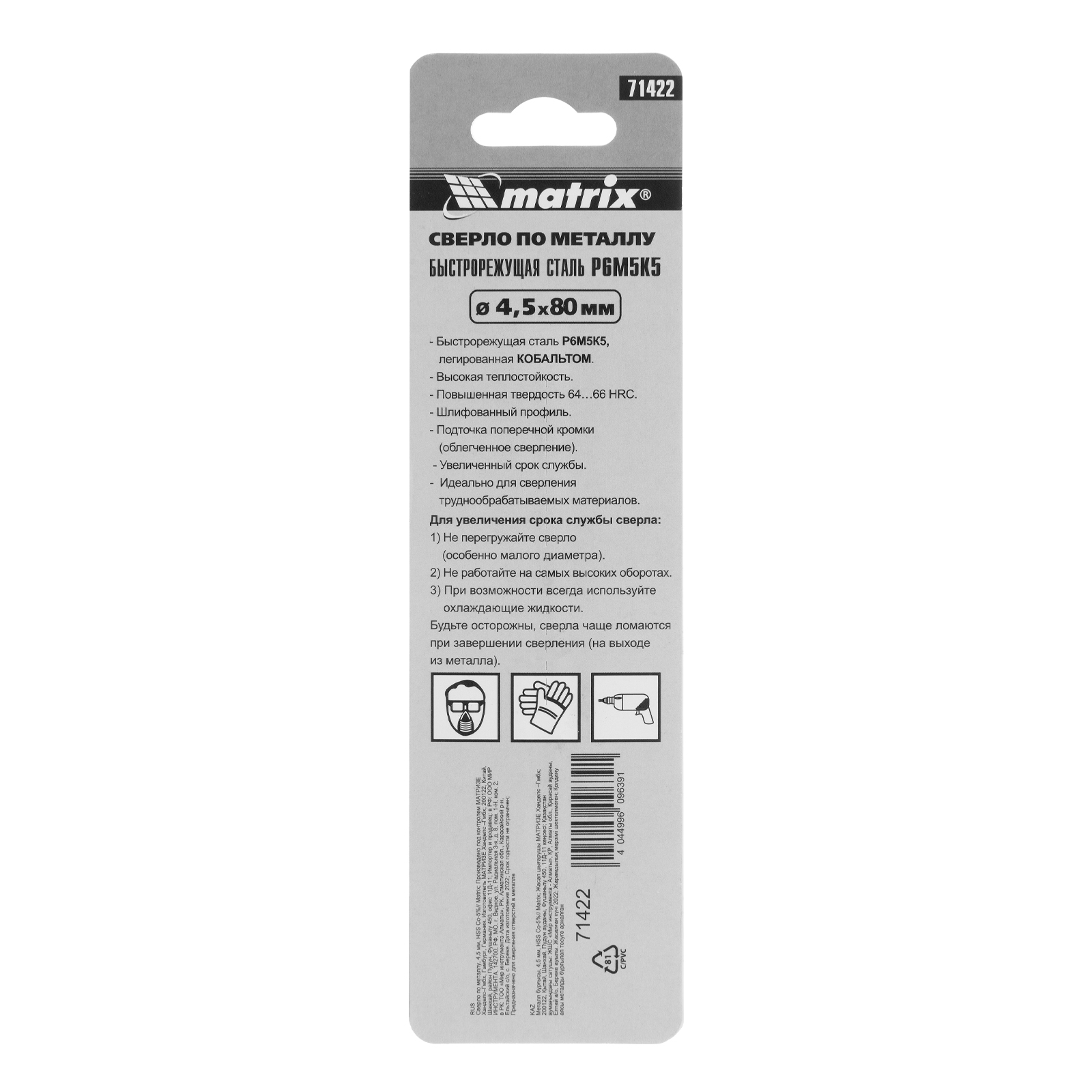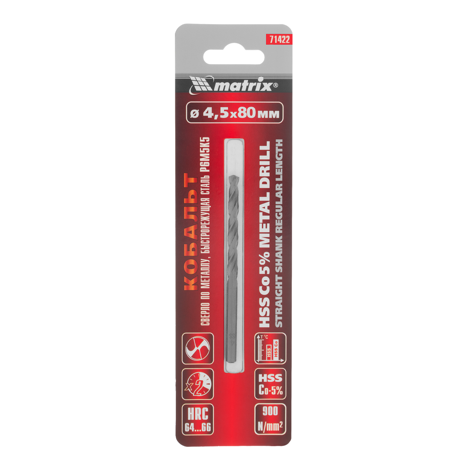 Сверло Matrix 71422 диаметром 4,5 мм, из стали HSS Co-5%, имеет угол заточки 135 градусов, оптимальный для сверления легированных и цветных металлов. Подходит для профессионального использования на строительной площадке.