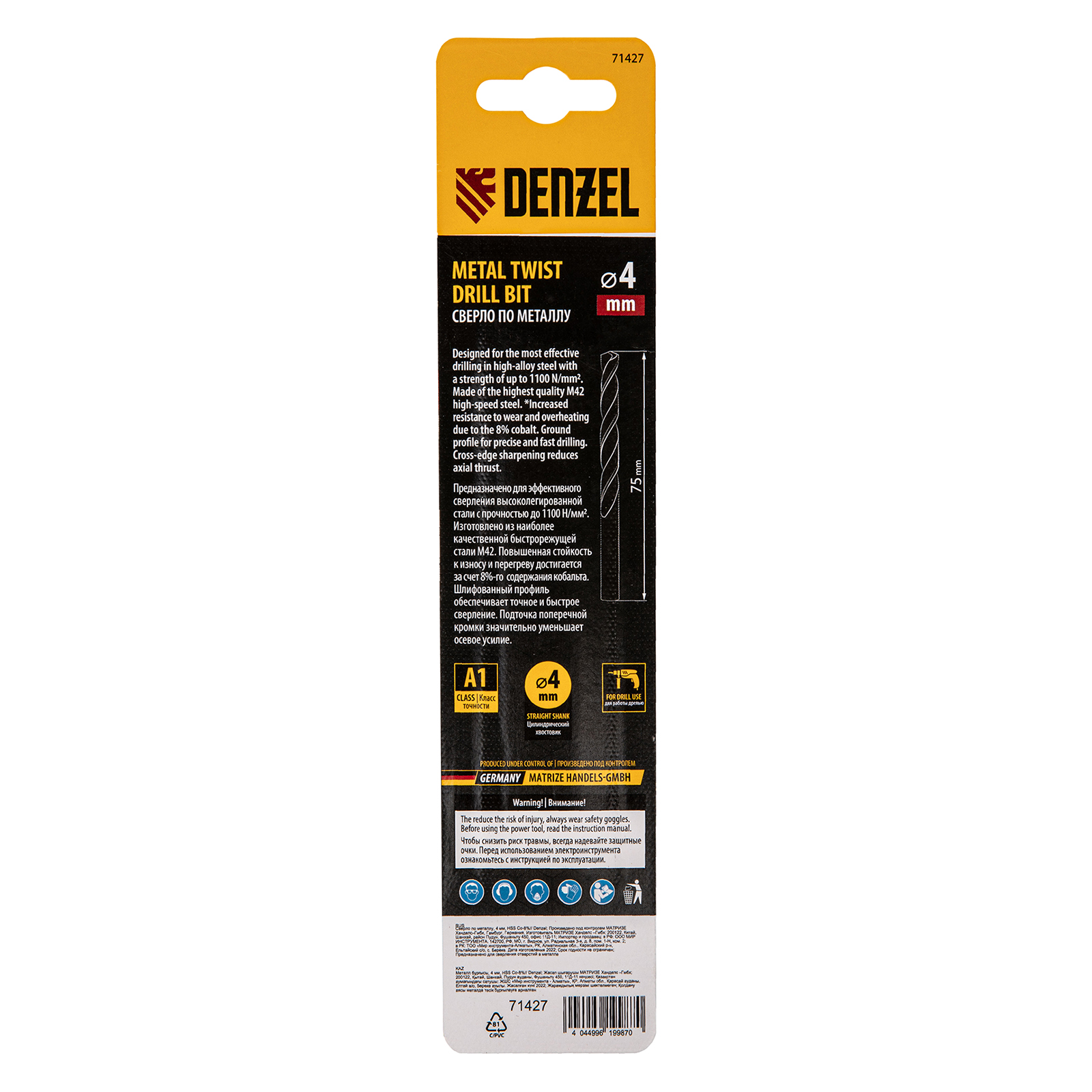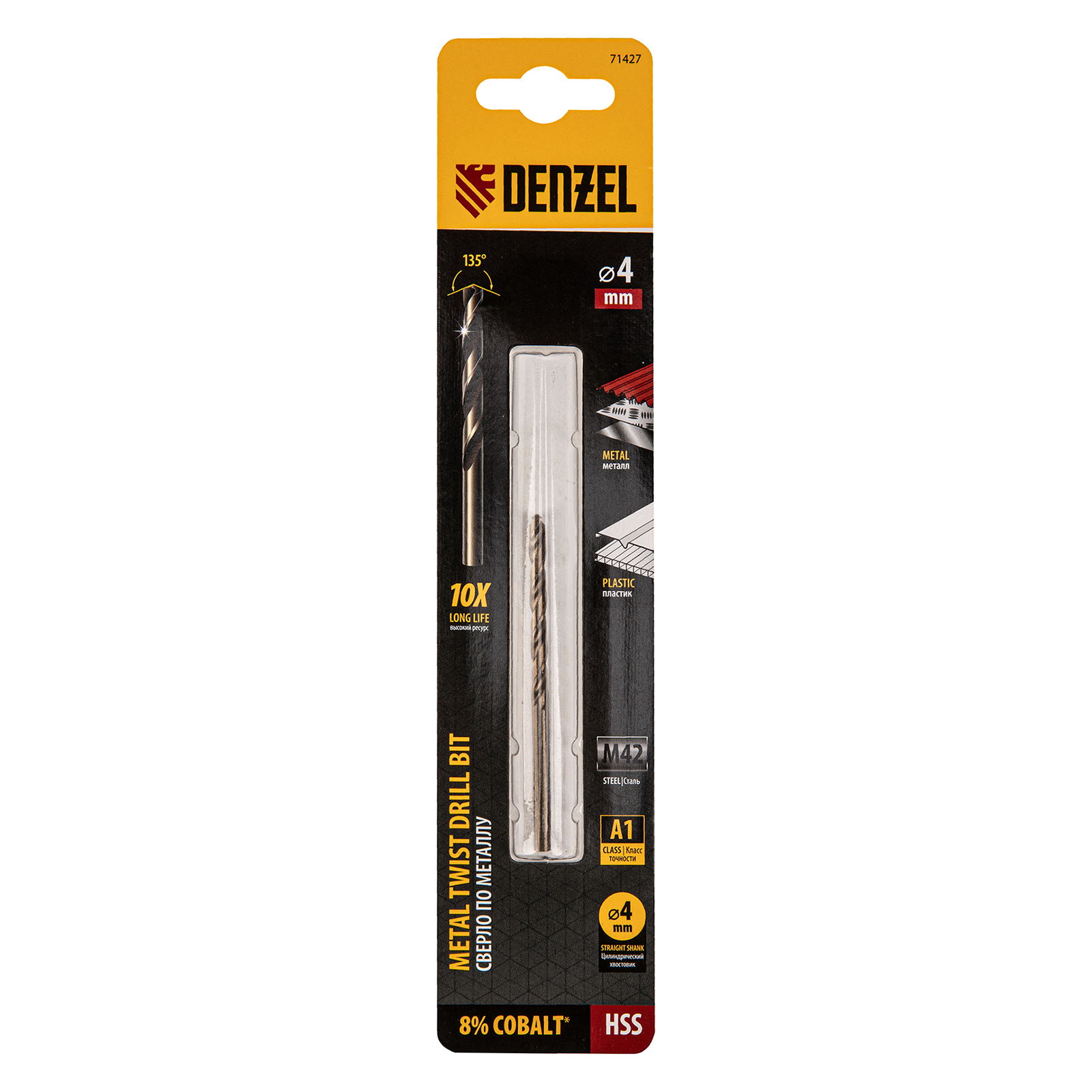 Кобальтовое сверло по металлу Denzel 71427 диаметром 4 мм, из стали HSS Co-8%, позволяет получать отверстия высокой точности в нержавеющей стали, цветных металлах, легированных и нелегированных сталях с пределом прочности до 1100 Н/мм2, а также в жестком пластике. Угол заточки 135° обеспечивает повышенную точность и чистоту сверления.
