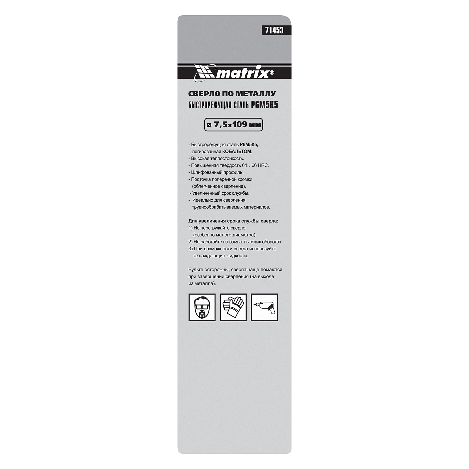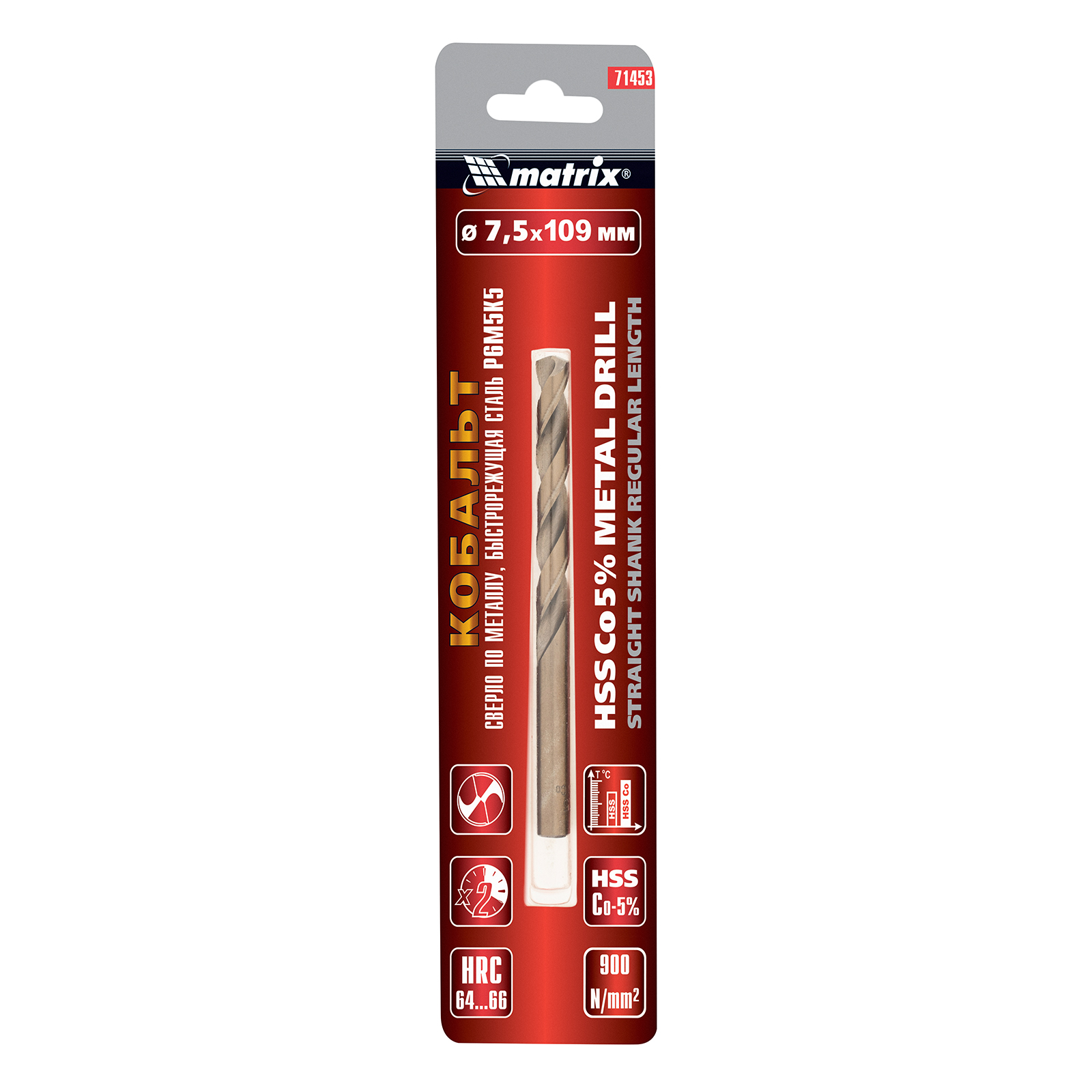 Сверло Matrix 71453 диаметром 7,5 мм, из стали HSS Co-5%, имеет угол заточки 135 градусов, оптимальный для сверления легированных и цветных металлов. Подходит для профессионального использования на строительной площадке.