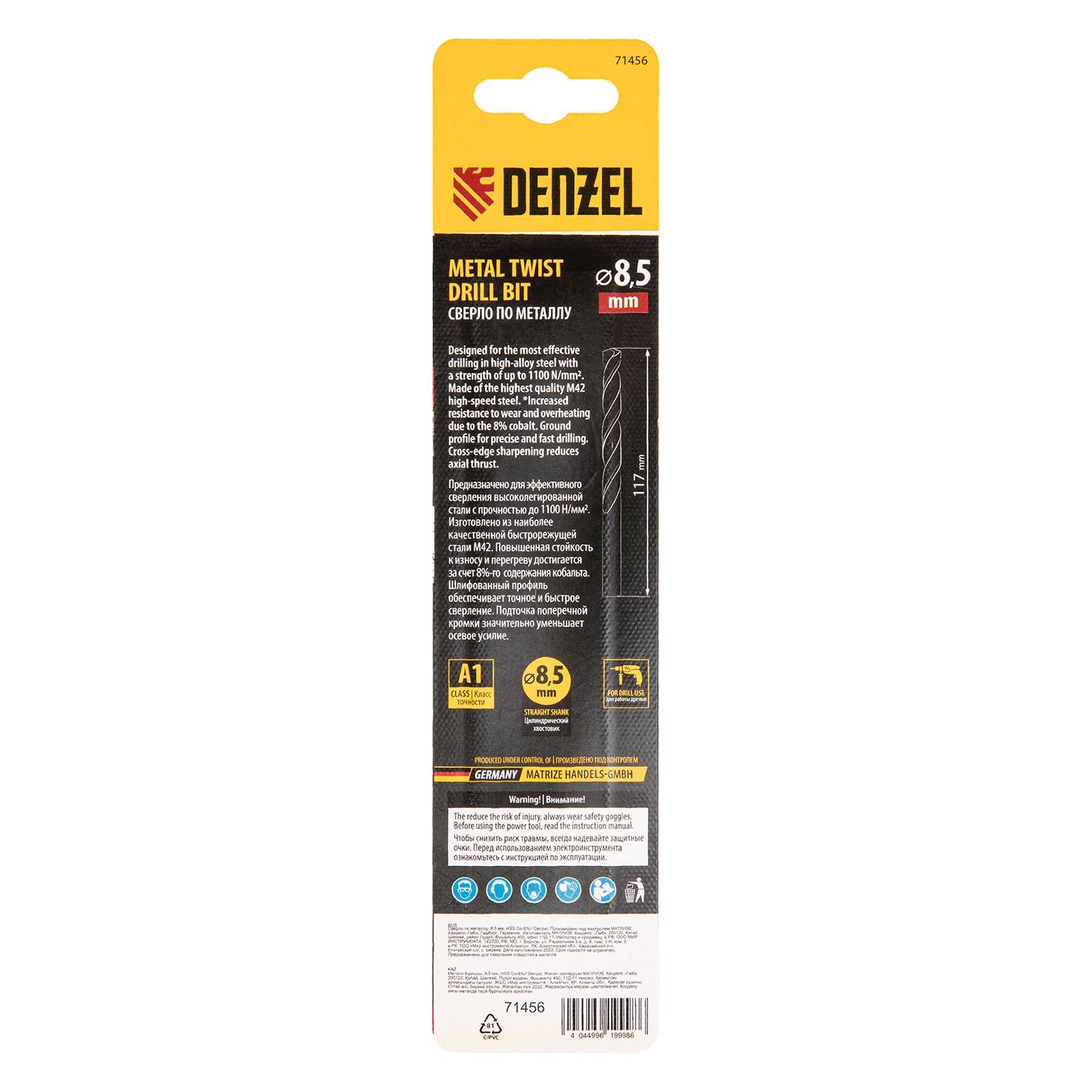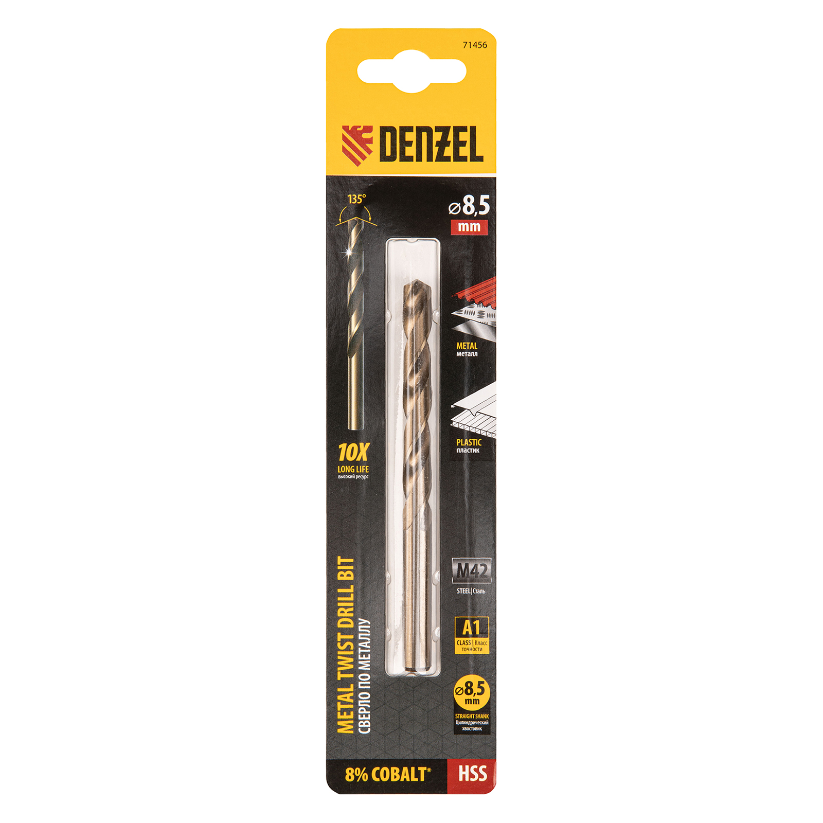 Кобальтовое сверло по металлу Denzel 71456 диаметром 8,5 мм, из стали HSS Co-8%, позволяет получать отверстия высокой точности в нержавеющей стали, цветных металлах, легированных и нелегированных сталях с пределом прочности до 1100 Н/мм2, а также в жестком пластике. Угол заточки 135° обеспечивает повышенную точность и чистоту сверления.
