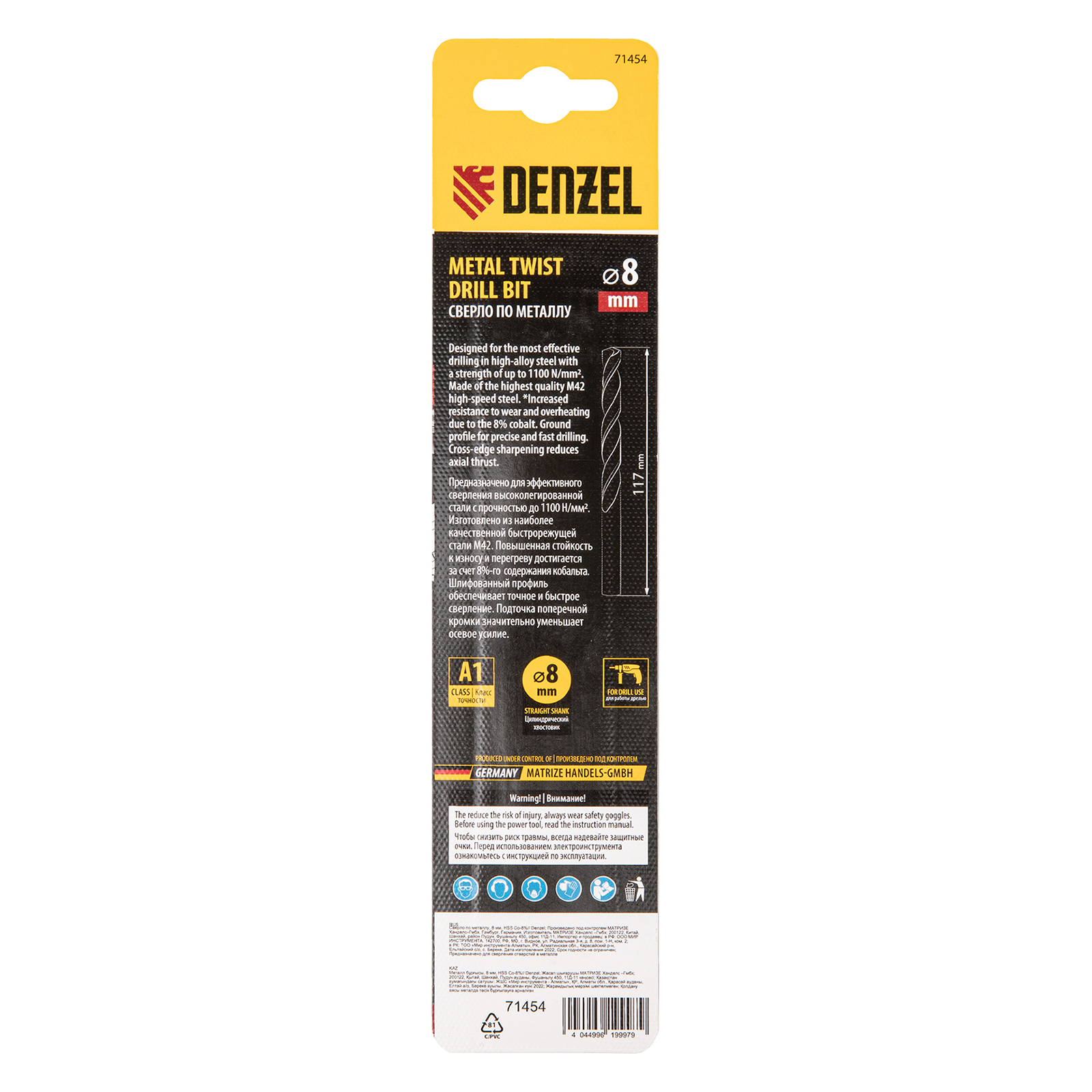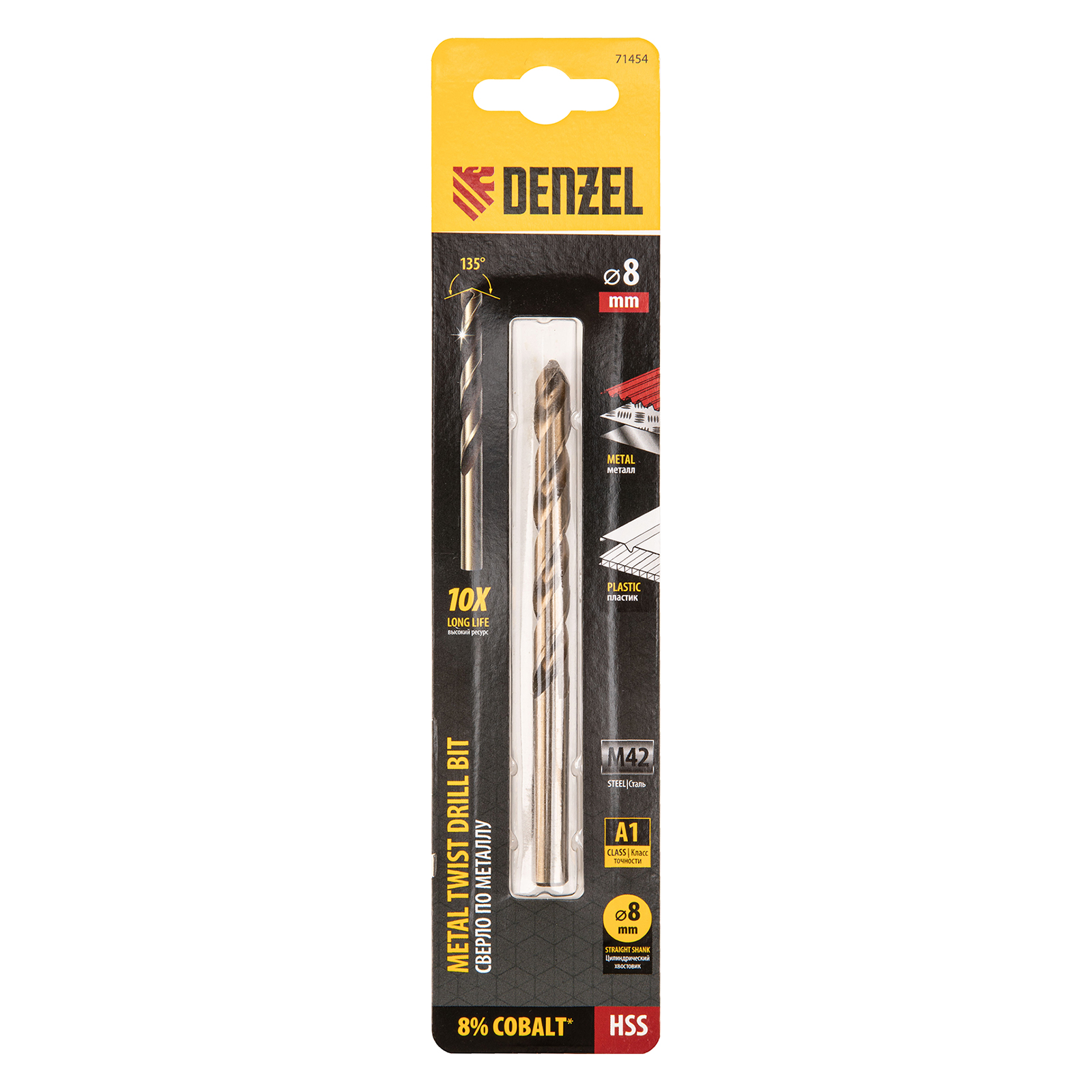 Кобальтовое сверло по металлу Denzel 71454 диаметром 8 мм, из стали HSS Co-8%, позволяет получать отверстия высокой точности в нержавеющей стали, цветных металлах, легированных и нелегированных сталях с пределом прочности до 1100 Н/мм2, а также в жестком пластике. Угол заточки 135° обеспечивает повышенную точность и чистоту сверления.