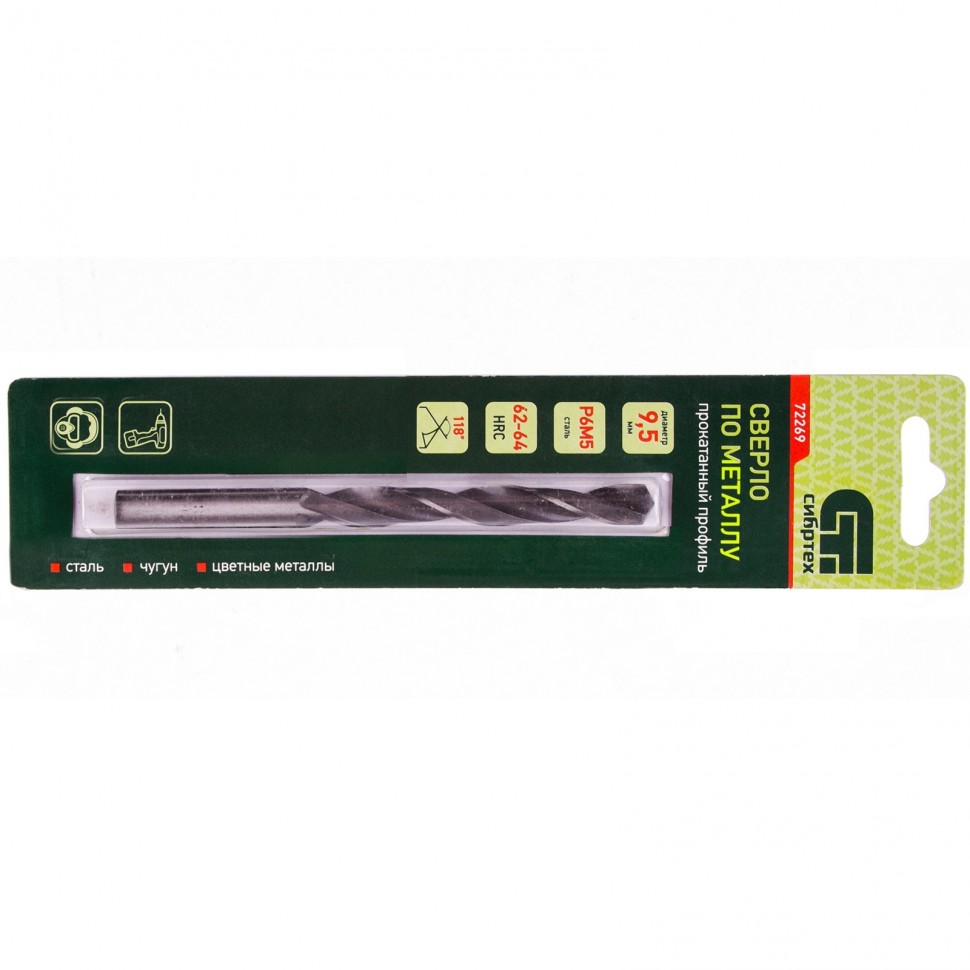 Сверло по металлу Сибртех 72269 из стали P6M5 имеет угол заточки 118 градусов и позволяет получать отверстия диаметром 9,5 мм в черных и тяжелых металлах, в том числе стали, чугуне и твердой бронзе. Сверло отличается наиболее выгодной стоимостью по сравнению с другими моделями из стали P6M5. Используется для монтажно-сборочных работ, будет полезно в быту.
