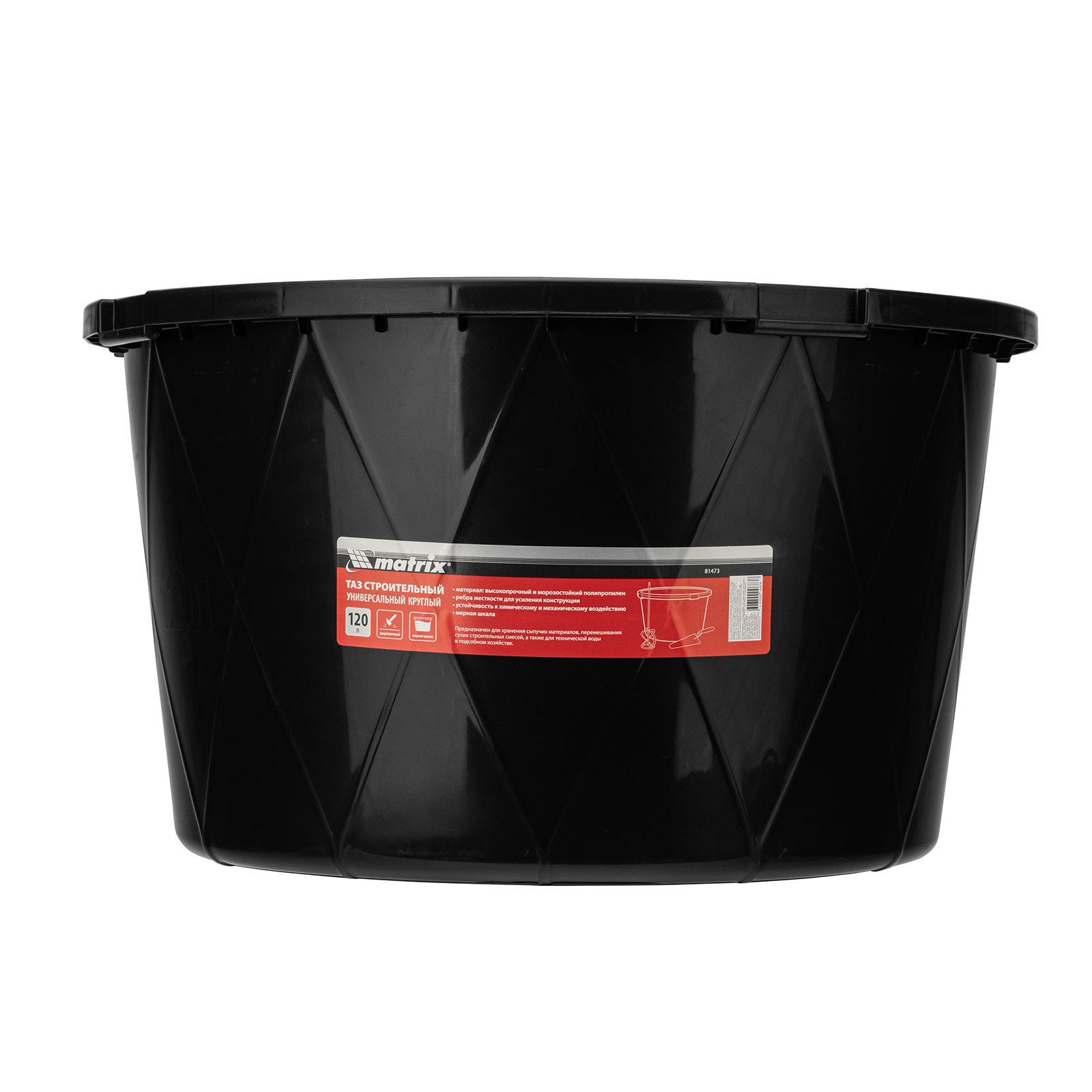 Круглый строительный ударопрочный таз Matrix 81473 с ребрами жесткости, объемом 120 л, универсален в применении: он используется для перемешивания строительных смесей, хранения сыпучих материалов и воды для технических нужд. Будет полезен во время проведения строительно-отделочных работ, пригодится также в подсобном хозяйстве и на огороде.