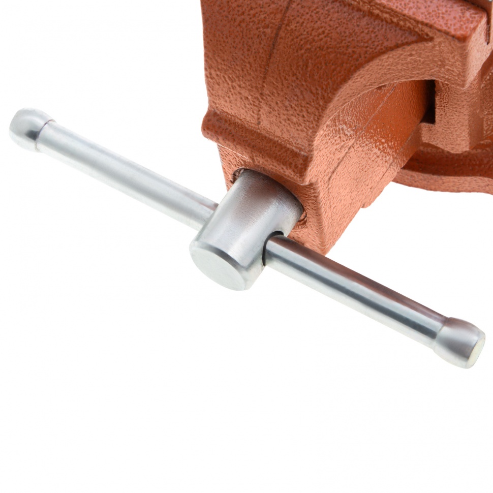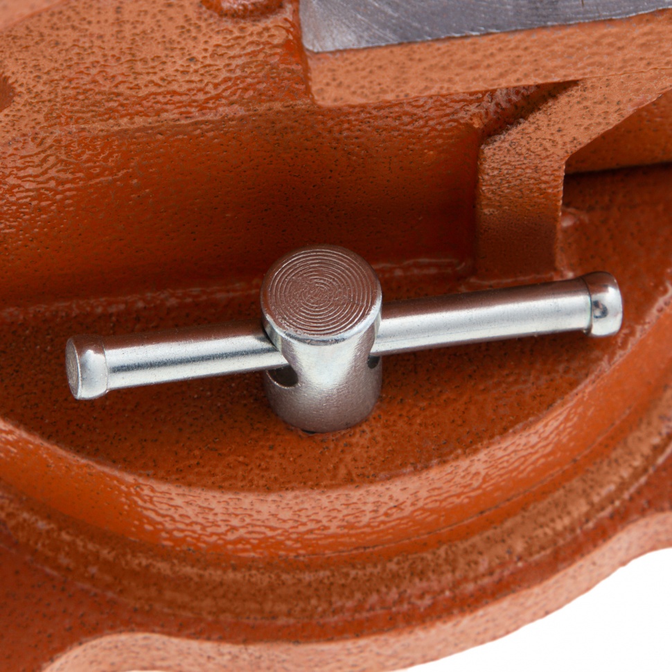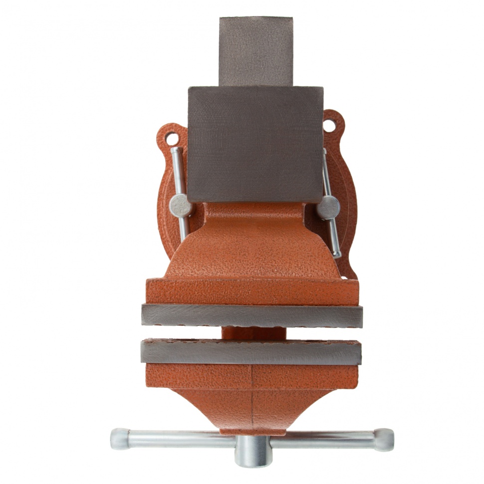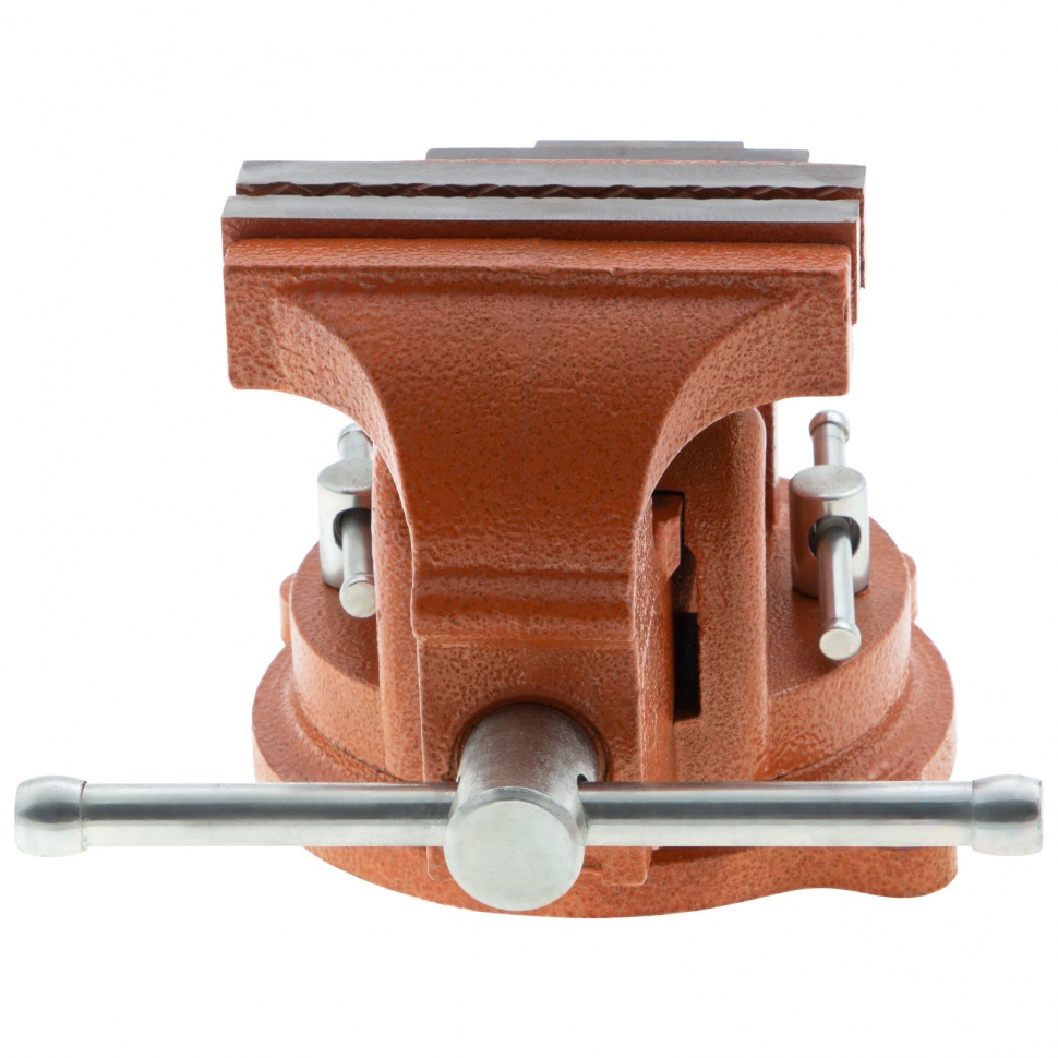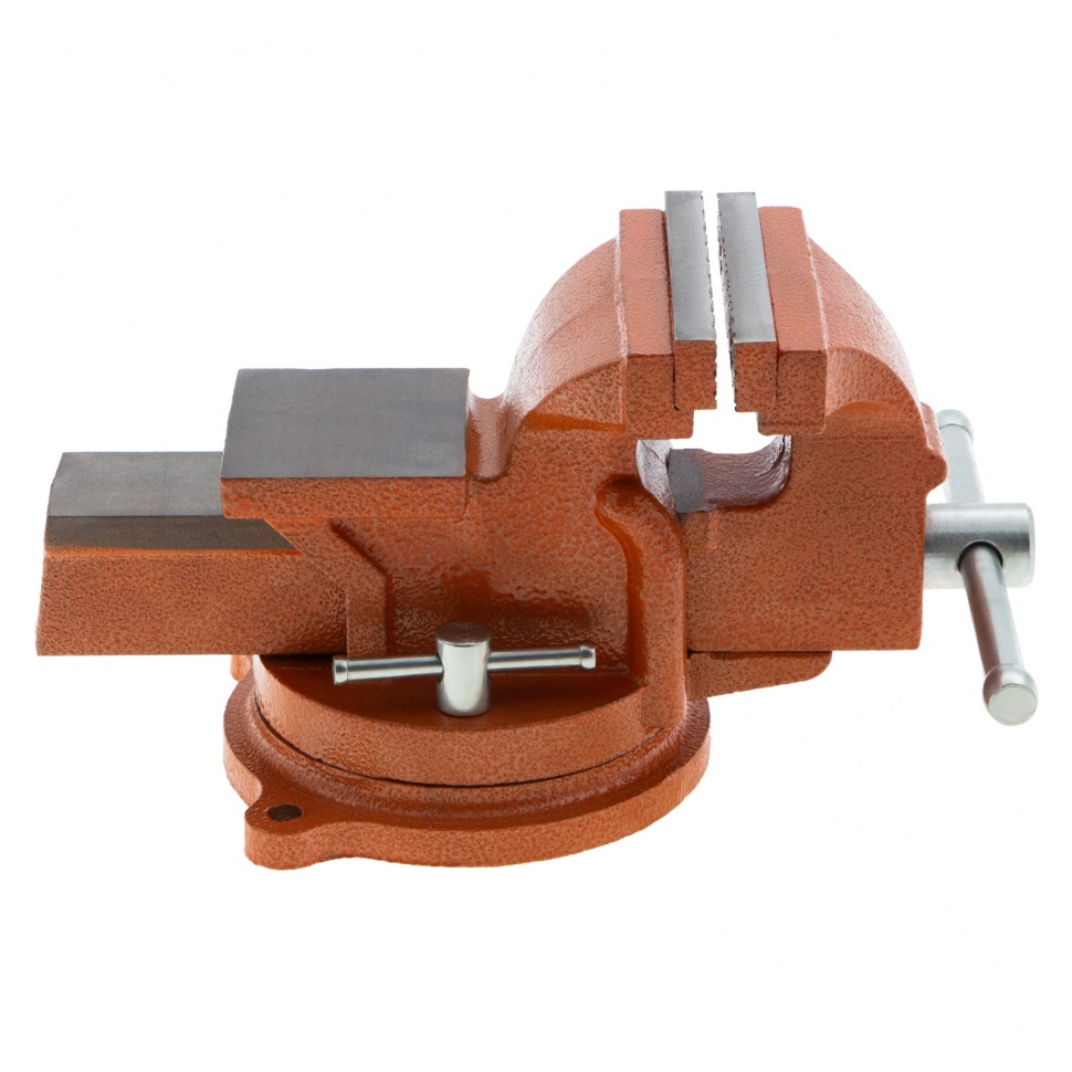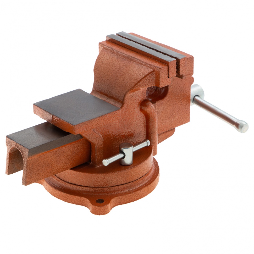 Поворотные слесарные тиски Sparta 186235 с наковальней и губками шириной 100 мм, — инструмент для захвата деталей размером до 75 мм. Будут полезны для обработки малогабаритных заготовок в частной мастерской или гараже.