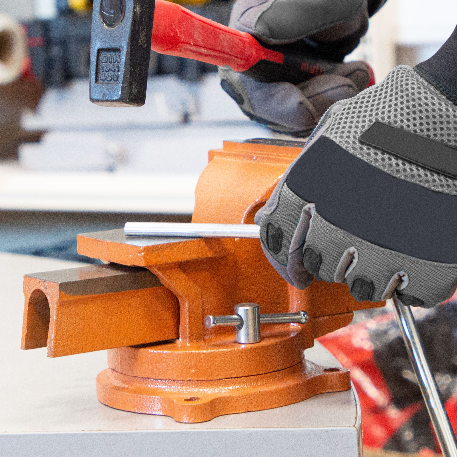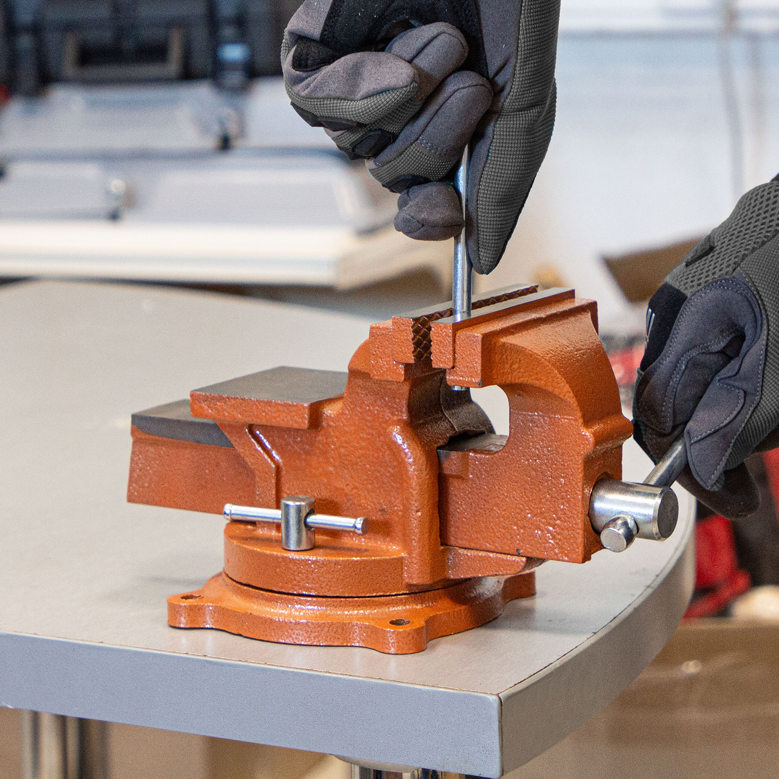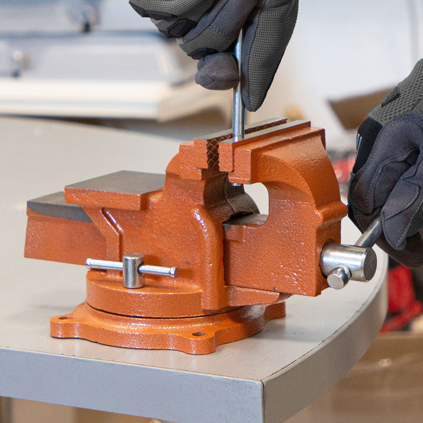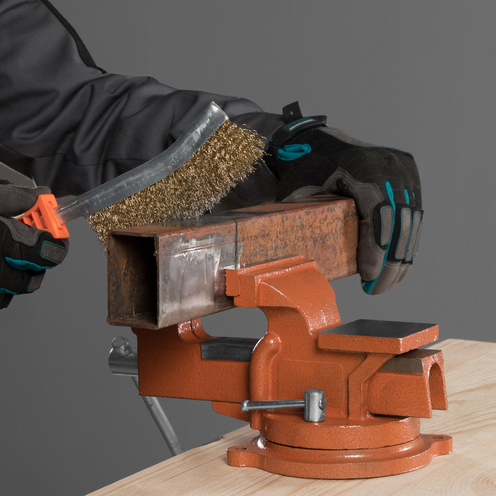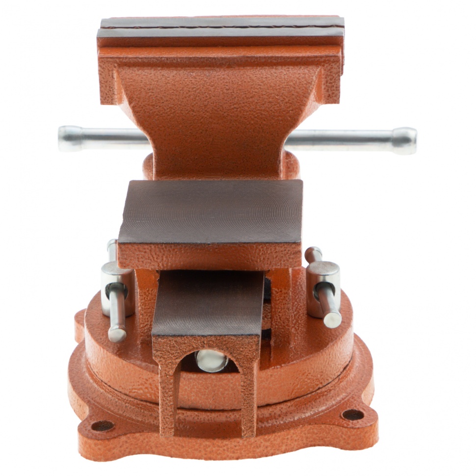 Поворотные слесарные тиски Sparta 186235 с наковальней и губками шириной 100 мм, — инструмент для захвата деталей размером до 75 мм. Будут полезны для обработки малогабаритных заготовок в частной мастерской или гараже.