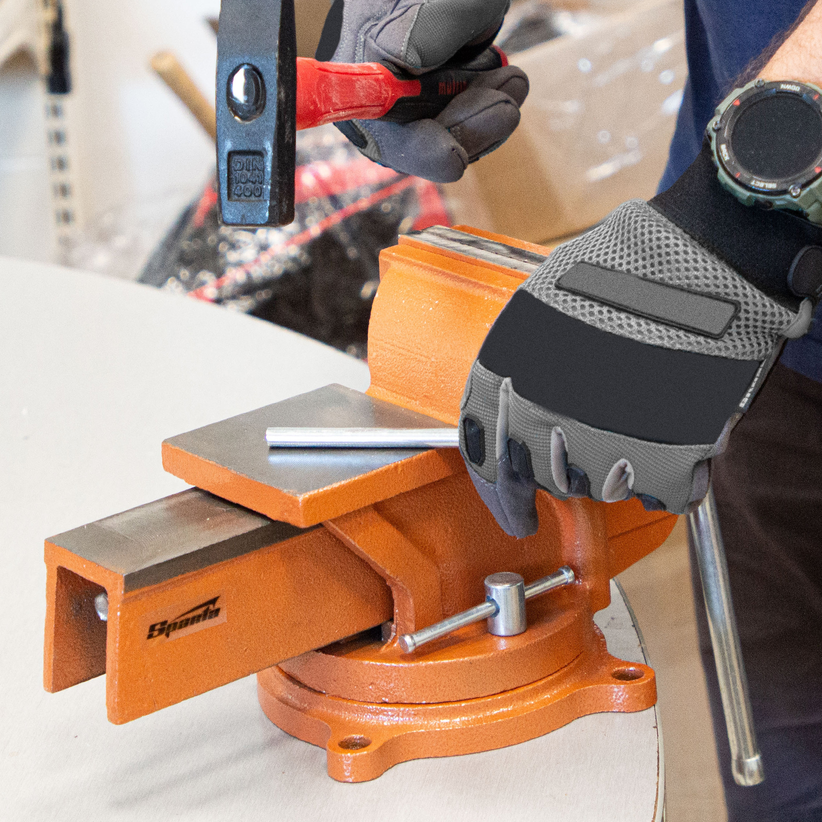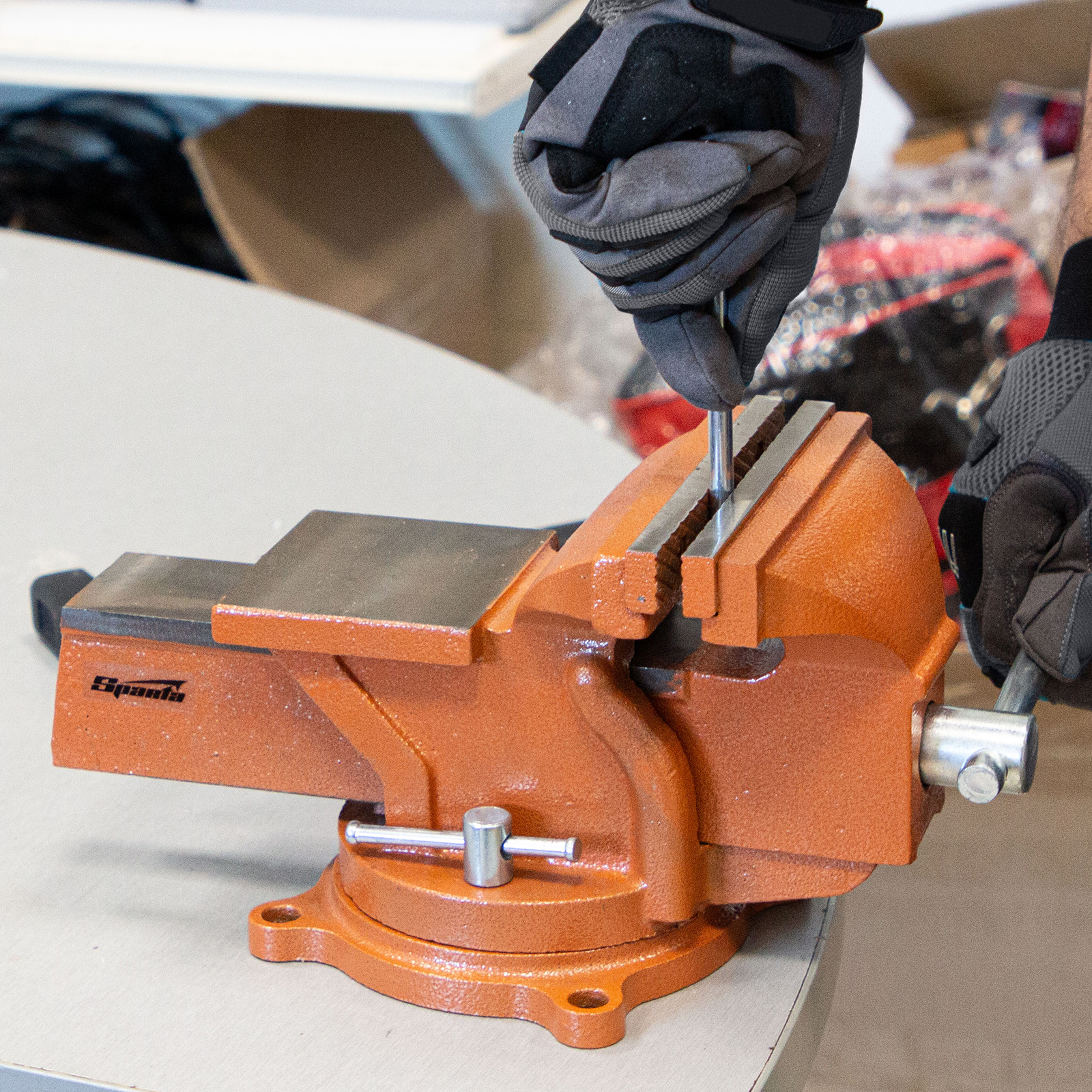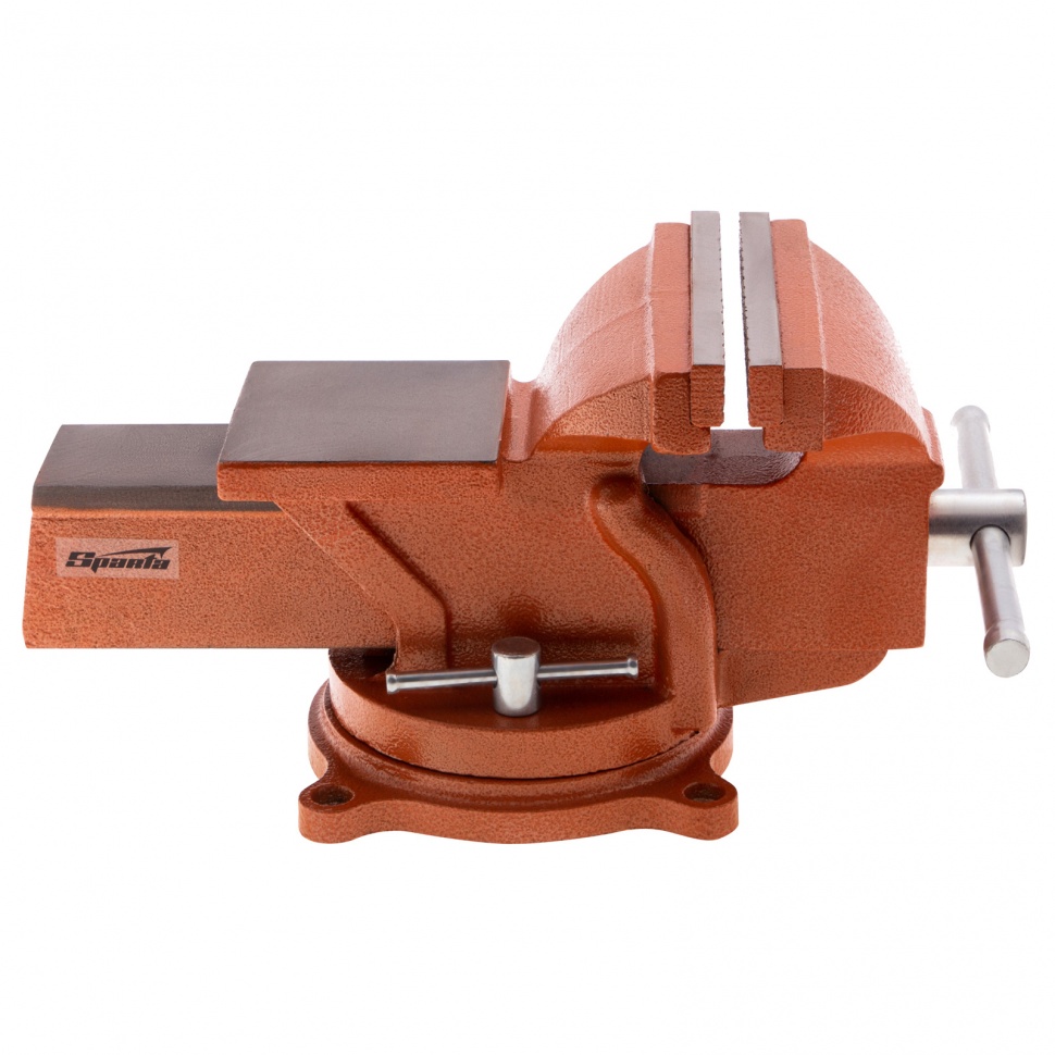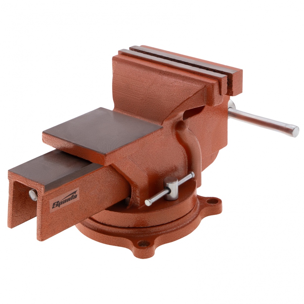 Поворотные слесарные тиски Sparta 186275 с наковальней, ширина губок 150 мм, — это небольшой инструмент для захвата деталей до 125 мм. Будут полезны в частной мастерской или гараже для удобства обработки крупногабаритных заготовок.