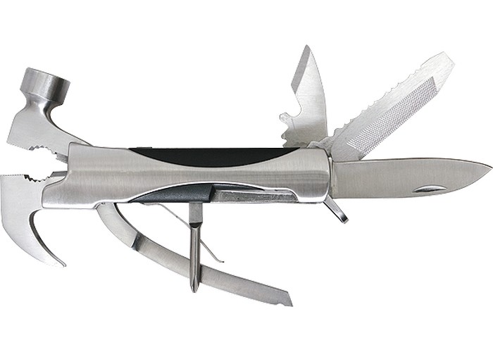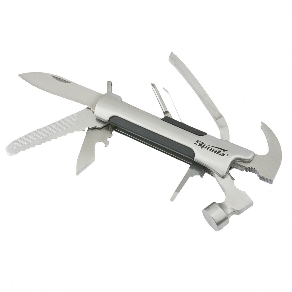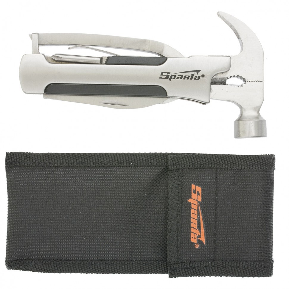 Трансформер Sparta 176075 выполняет 12 функций и включает в себя предметы, необходимые дома, на даче, рыбалке или охоте, а также в походе или поездке. Ножом можно разрезать веревку или вскрыть упаковку, а консервным ножом-открывалкой — открыть банку или бутылку. Молоток-гвоздодер пригодится для забивания и выпрямления гвоздей, а отвертки — для работы с резьбовым крепежом.