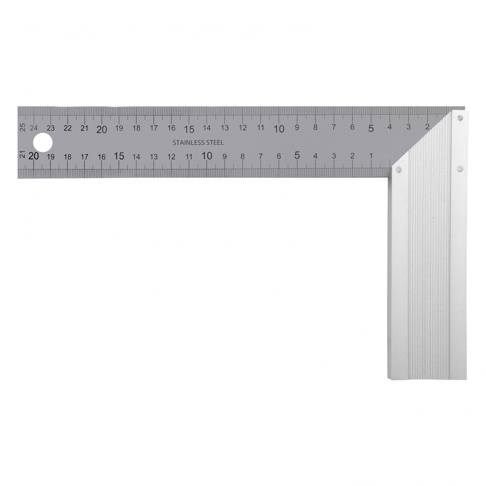 Стальной угольник Denzel 32396 длиной 250 мм, с градуировкой, алюминиевым основанием и полотном из нержавеющей стали, используется для построения и контроля углов. Будет полезен для выполнения столярных и строительных работ.