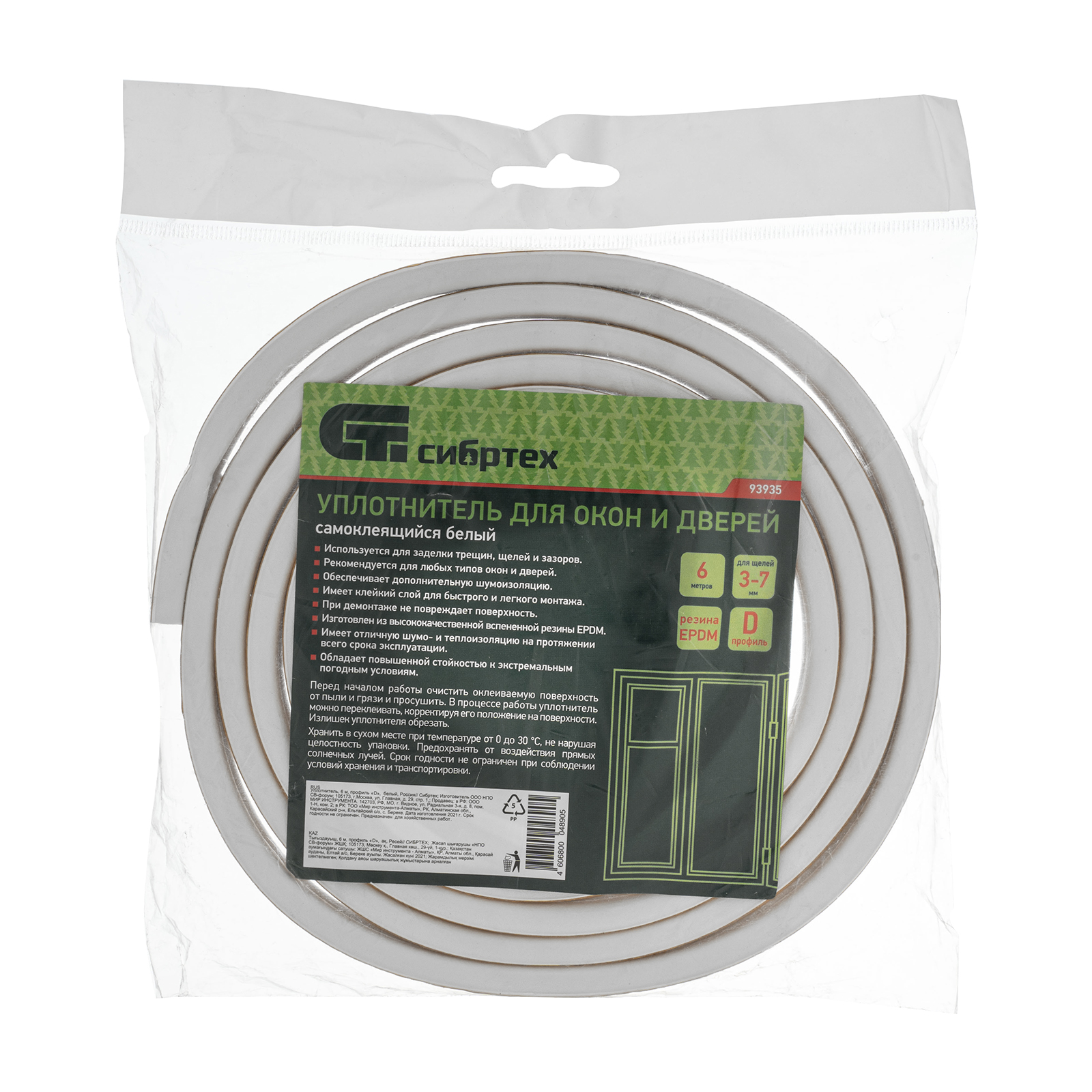 Белый уплотнитель Сибртех 93935 с профилем «D», длиной 6 м, предназначен для герметизации зазоров шириной 3-7 мм в оконных рамах и дверных блоках. Защищает от шума, пыли, влаги, а также сохраняет тепло в помещении.