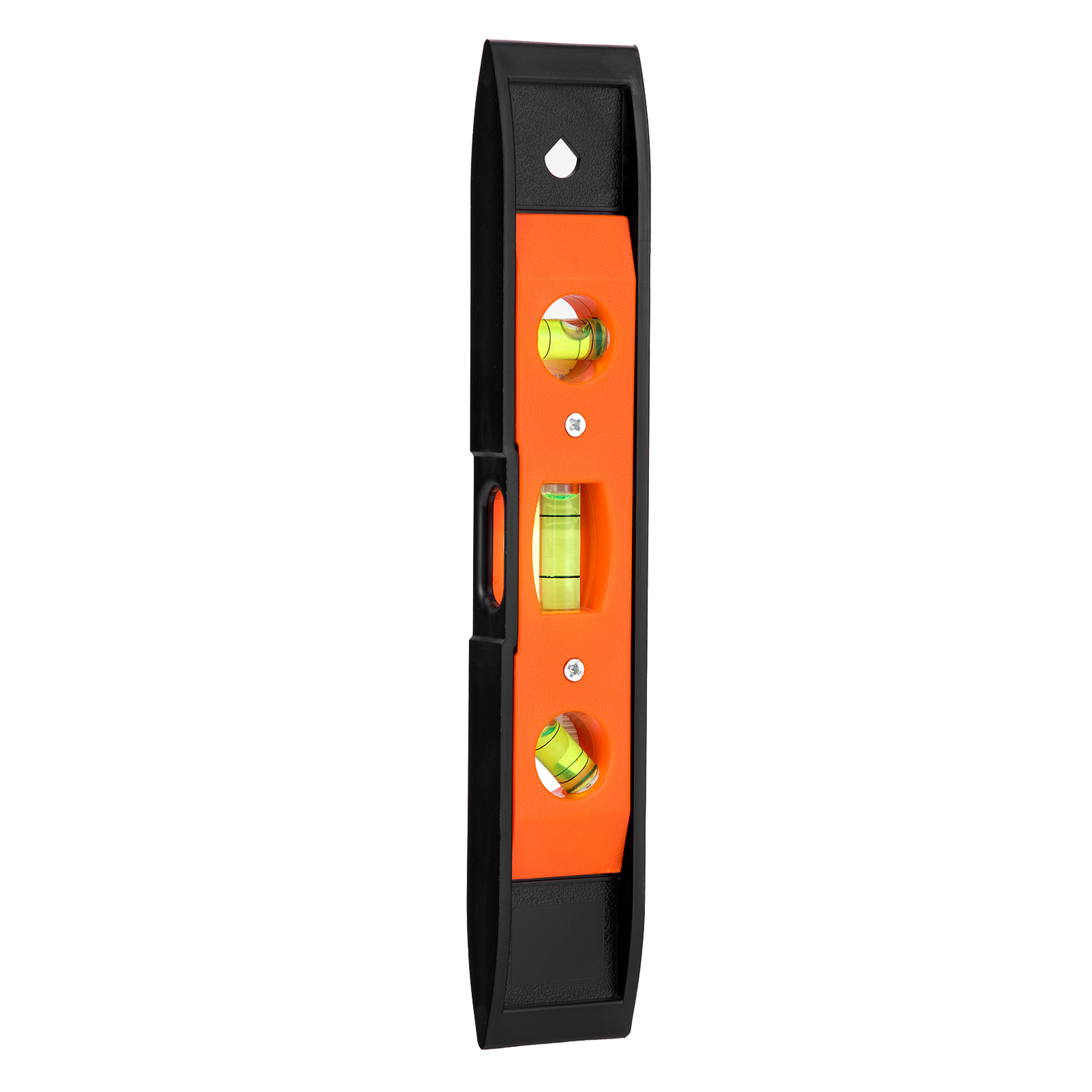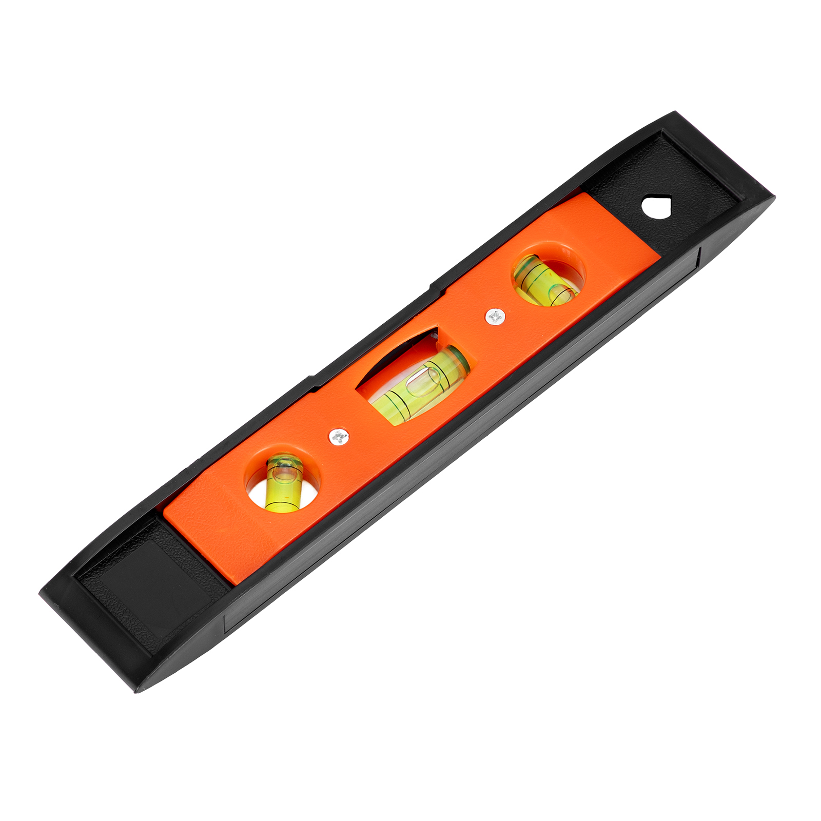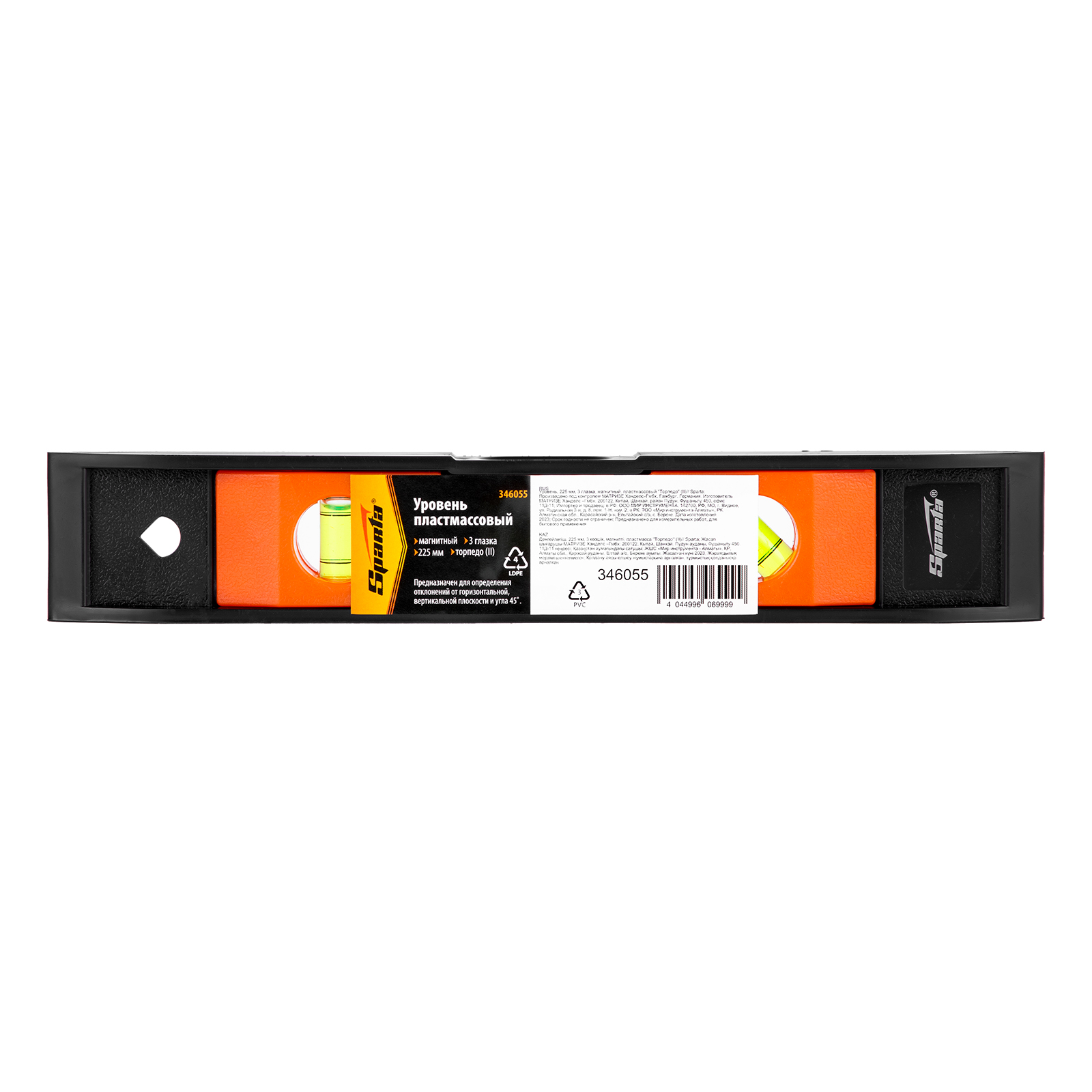 Пластмассовый уровень Sparta «Торпедо» (II) 346055 длиной 225 мм, магнитный, с 3 глазками, используется для контроля соответствия поверхностей вертикальной и горизонтальной плоскостям и углу 45 градусов. Благодаря компактности и небольшой длине инструмент удобен для работы в труднодоступных местах.