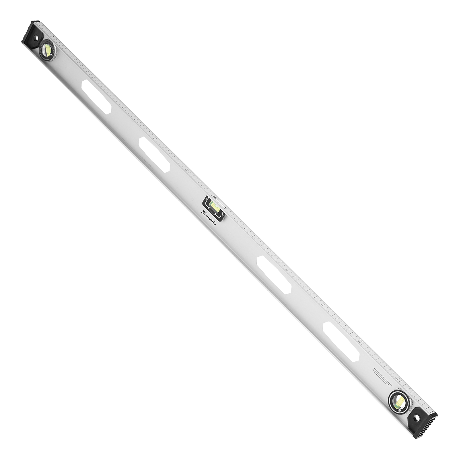 Алюминиевый уровень Matrix «Рельс» 34032 длиной 1200 мм имеет 3 глазка: 2 для проверки отклонений от заданной вертикали и горизонтали и 1 поворотный для проверки наклонных поверхностей.