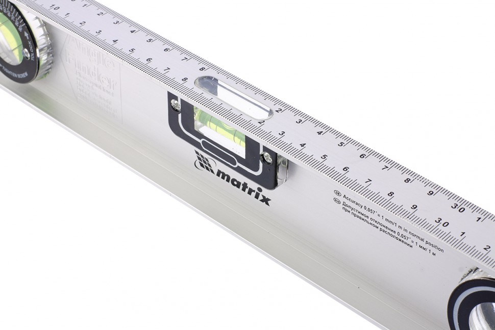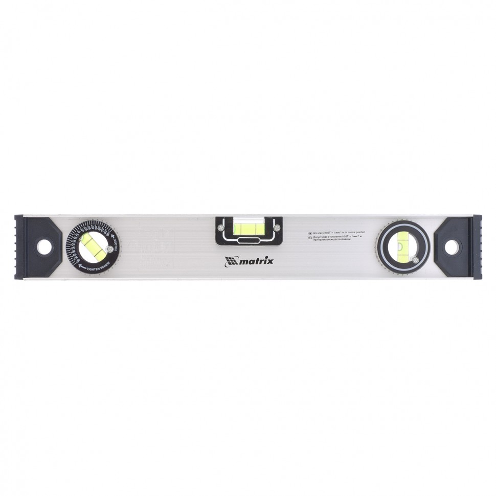 Алюминиевый уровень Matrix «Рельс» 34020 длиной 400 мм имеет 3 глазка: 2 для проверки отклонений от заданной вертикали и горизонтали и 1 поворотный для проверки наклонных поверхностей.